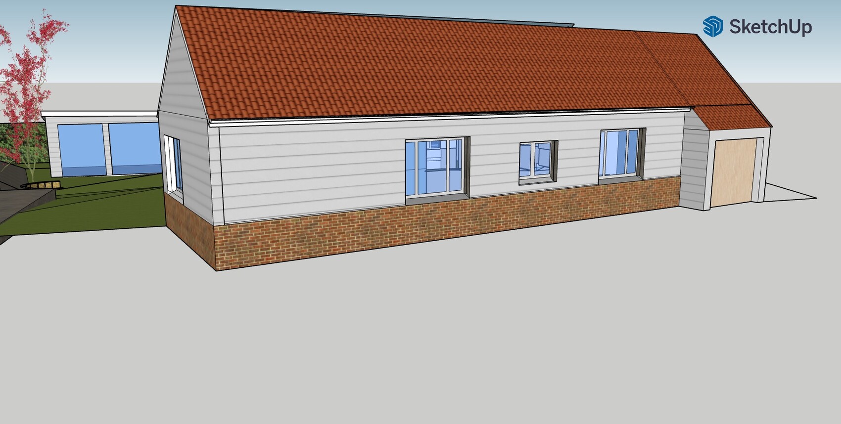 Darüber 12 cm Mineralwolle (nix anderes lieferbar) mit Holz UK und Boden/Leisten-Schalung aus Lärche mit skandinavischen Fensterkästen. (Ich hatte keine Lust die alle zu zeichnen, also fehlen die in der Skizze und senkrechtes Holzmuster habe ich als Textur nicht gefunden.)