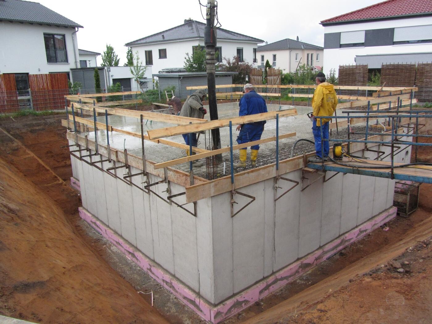 Betonfundament mit pinkfarbener Dämmung, Stahlbewehrung, Bauholz und Materiallager auf der Platte.