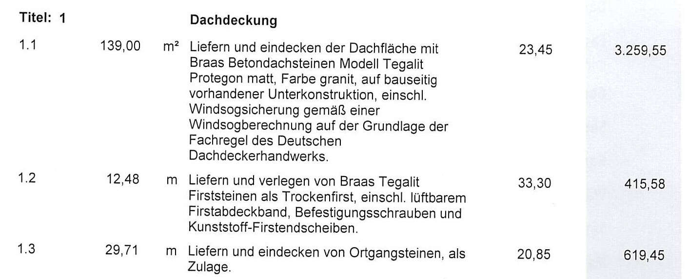 Tabelle zur Dachdeckung mit Positionen, Maßen und Kosten in einem Bauplan