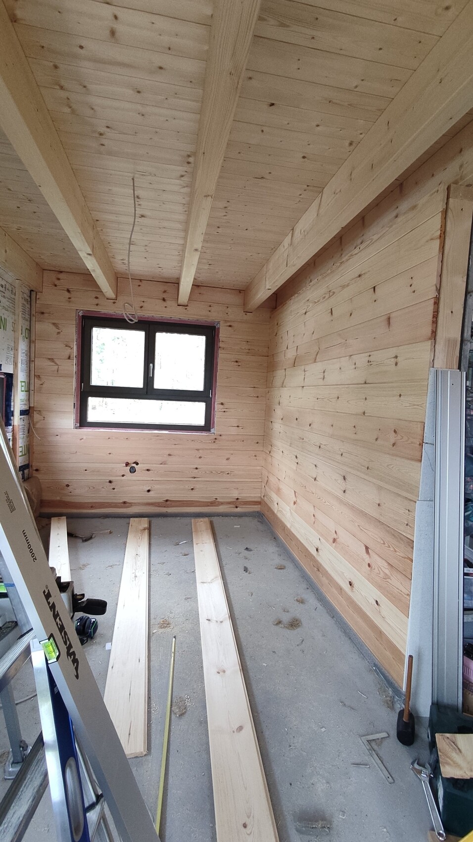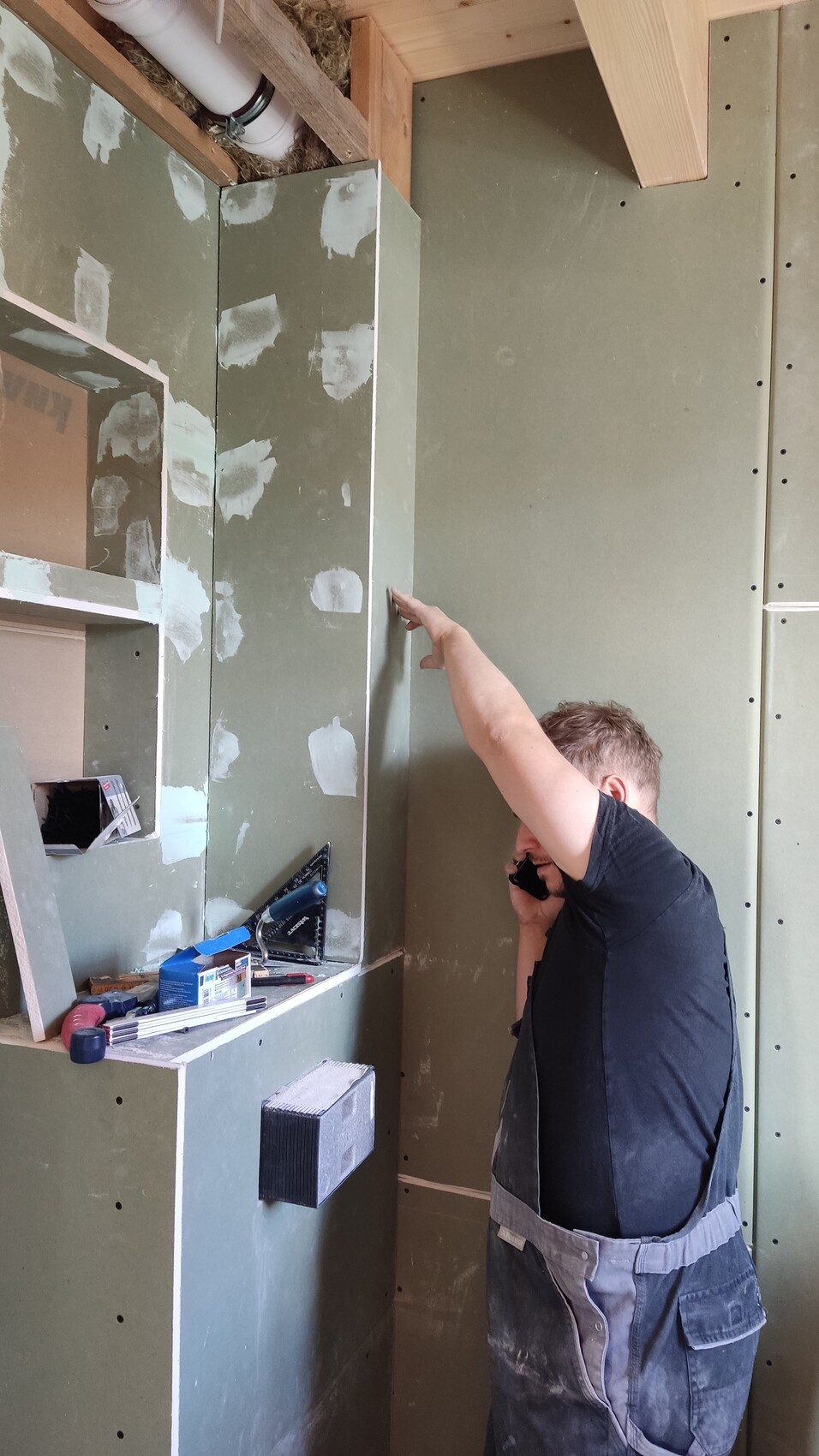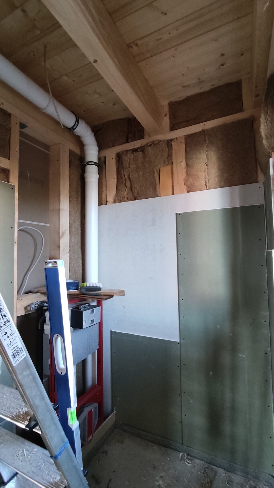 c) das Hauptbad oben dämmen, komplett beplanken, zwei Vorwände anbringen und das erste Holz für den Anschluss über den Fliesen (wir fliesen bis auf die Dusche alles auf 120 cm, darüber kommen Halbbohlen). Das muss bis zum 01.10. fertig sein, damit der Fliesenleger (WIR MACHEN MAL WAS NICHT SELBST, YAY) loslegen kann.