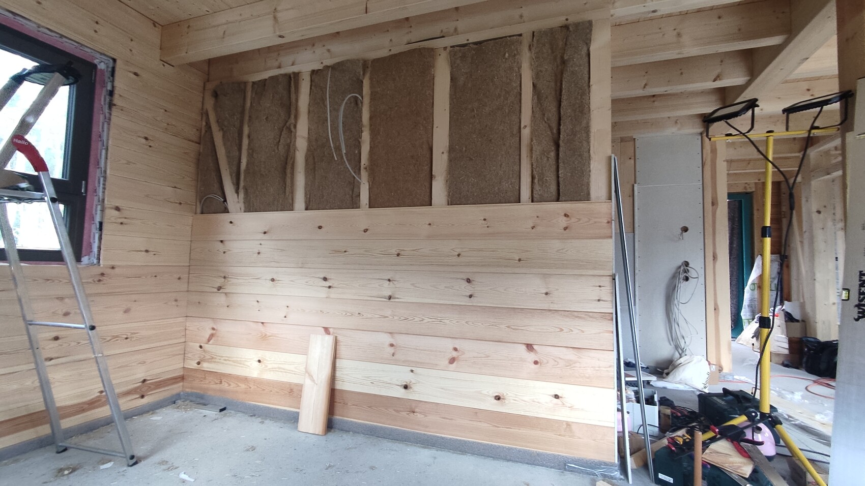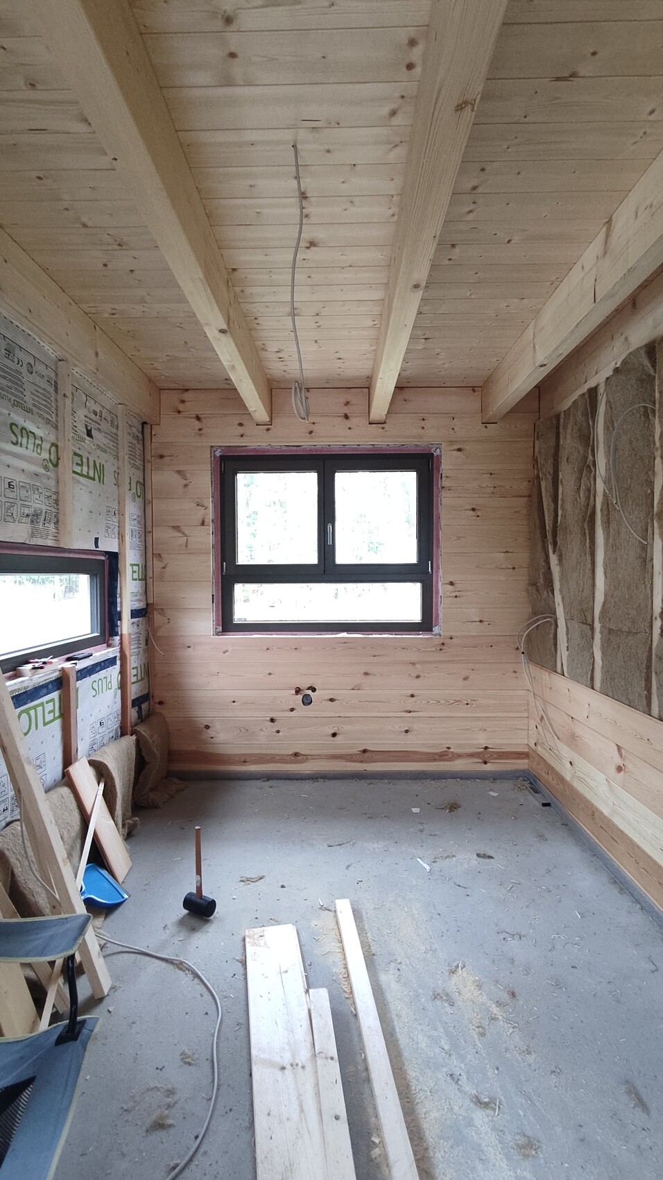Unsere Ausgangssituation, Wände noch nicht zu Ende beplankt, also insgesamt fehlen noch 1 - 2 Lagen Beplankung, Dämmung teilweise auch.