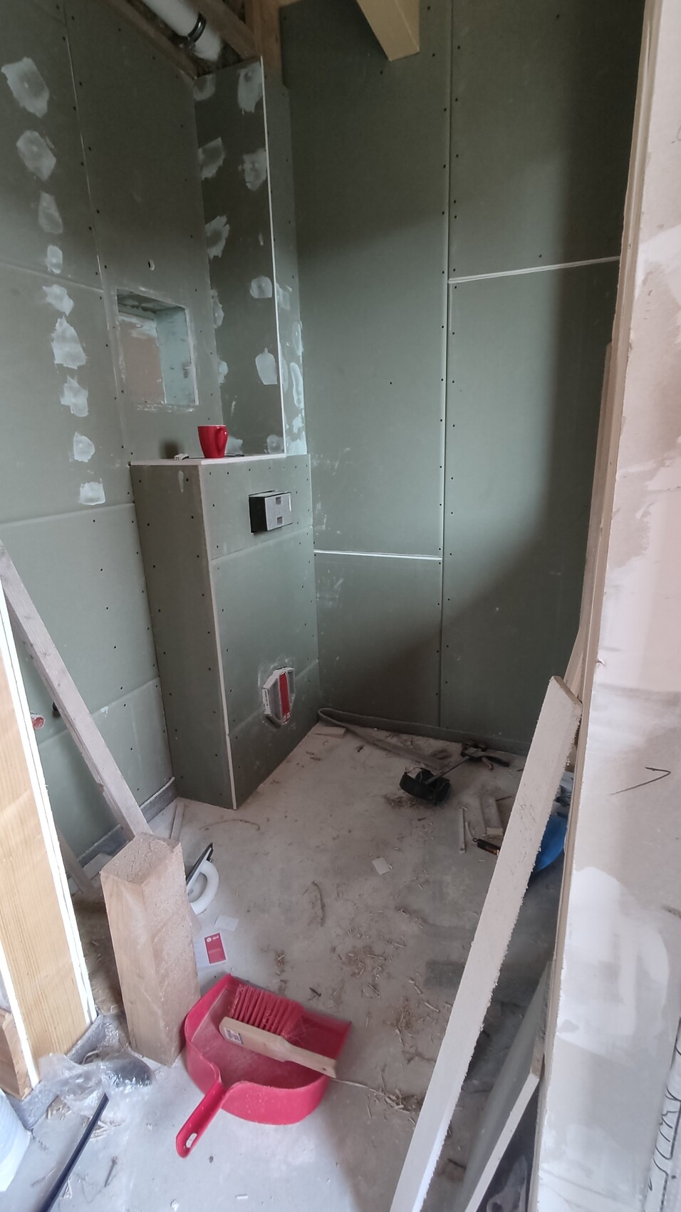 Geschafft haben wir von a) nur zwei Wände, da der Elektriker ne Steckdose vergessen hatte und erst nach 1,5 Wochen kam um das Kabel dafür noch zu legen. b) fehlt uns der Fliesenschneider und wir haben bemerkt, dass wir EWIG für das fitzelige Mini Bad gebraucht haben und die Zeit fürs Bad oben knapp wurde, daher noch keine Q Spachtelung und keine Fliesen dran. c) siehe b.