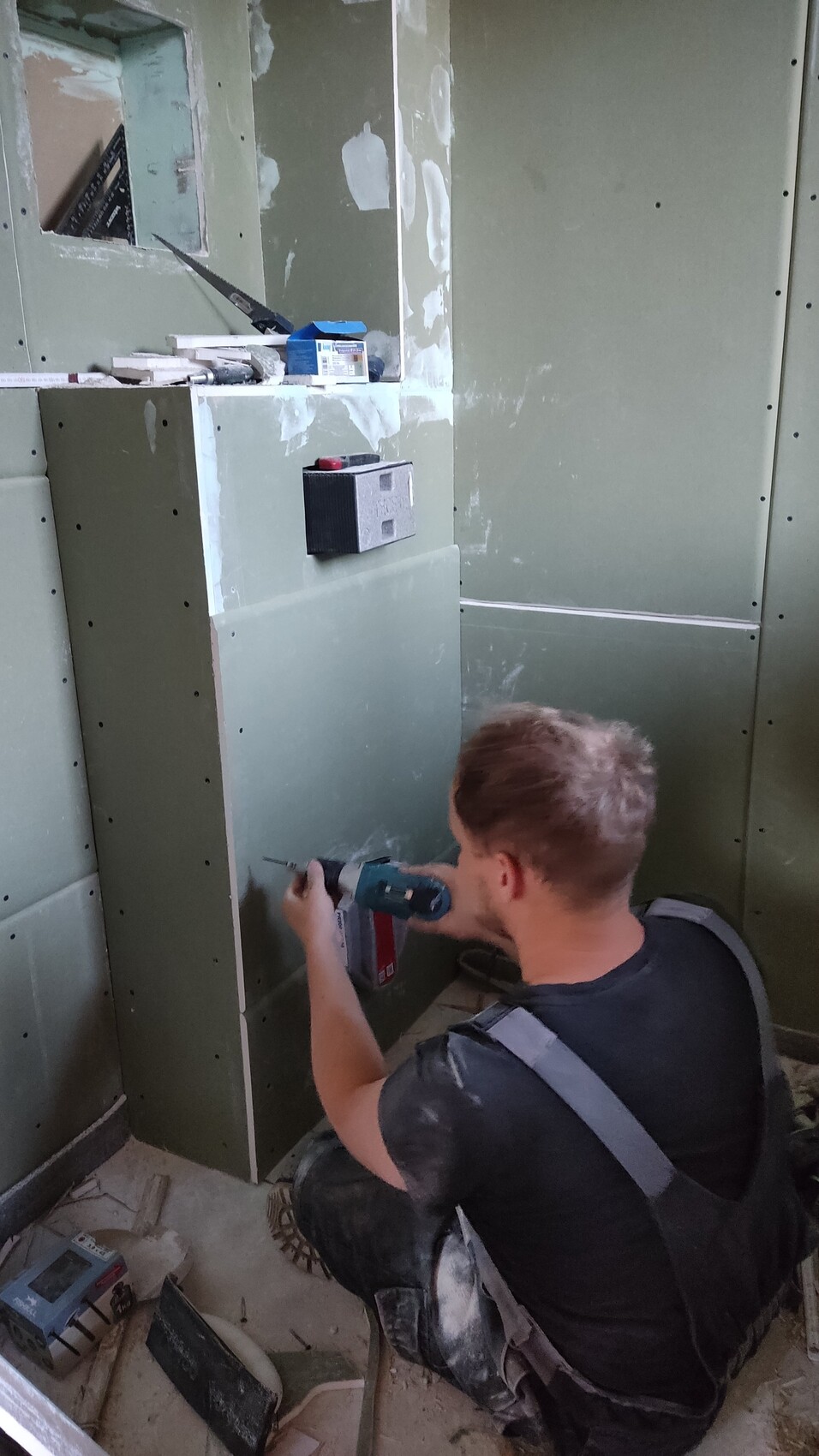 b) das Gäste-WC komplett dämmen und beplanken, die Vorwand bauen, beplanken und Fliesen. Außerdem in Q2 oder Q3 spachteln, damit wir die Wände dann streichen bzw tapezieren können. Dann können die Sanis die Toilette und das waschbecken einbauen und wir werden das Dixie los