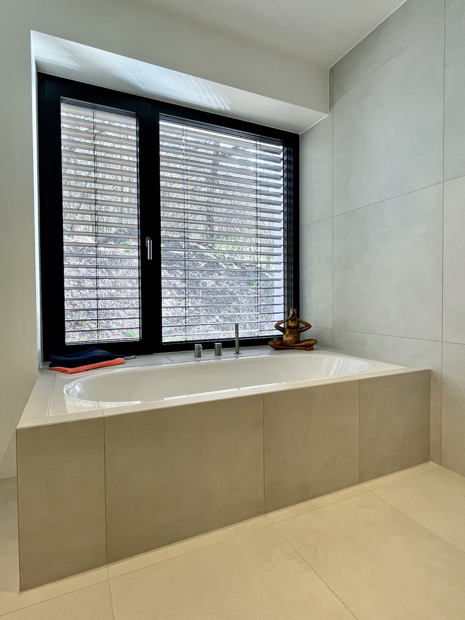 wir haben an den Fenstern zur Dachterrasse keine Raffstores. Grund ist die aufwändige Statik an dieser Stelle. Dazu hätte das Terrassendach dicker werden müssen, was den Charakter des Hauses komplett verändert hätte und daher keine Option war. In der Decke ist in diesem Bereich nicht mal mehr Platz für eingelassene Vorhangschienen…