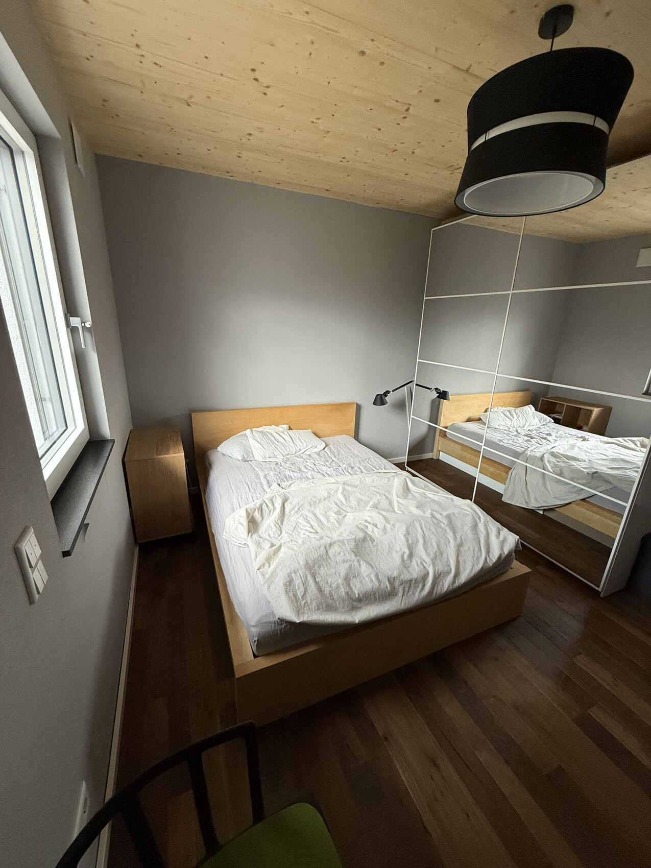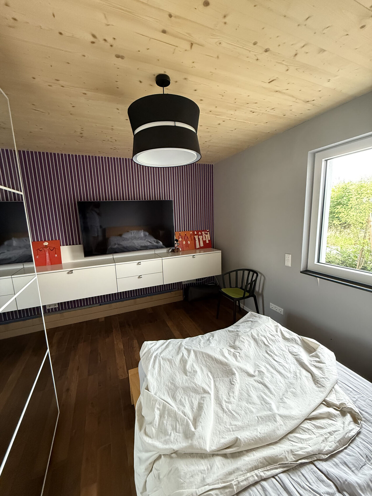 ![Schlafzimmer mit Holzboden, violetter Streifenwand, ungemachtem Bett und TV über weißer Kommode.[/ALt]](https://www.hausbau-forum.de/attachments/91910/)
