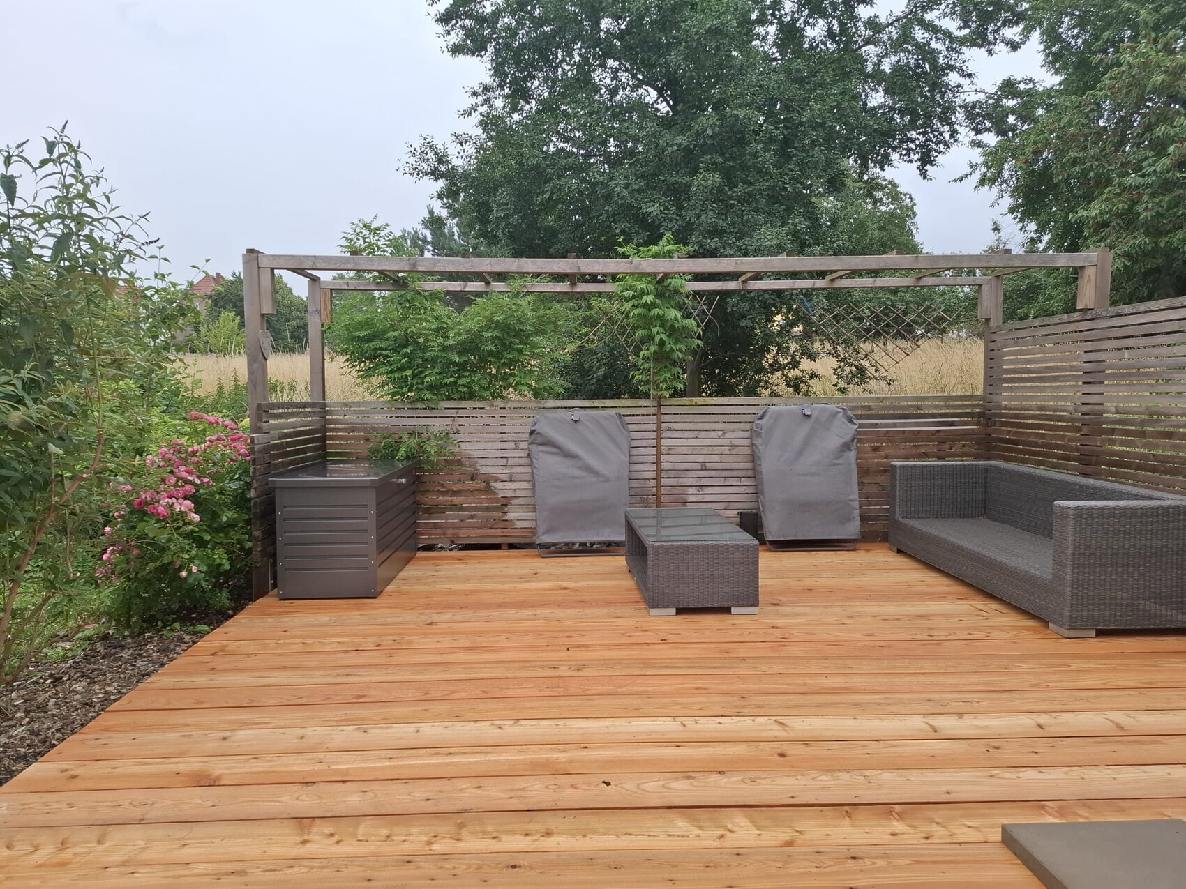 Ich spiele auch mit dem Gedanken ein Holzdeck ums ganze Haus rum zu bauen (allerdings dann auch bis Einganghöhe). Danke für die Inspiration, wie es aussehen könnte.