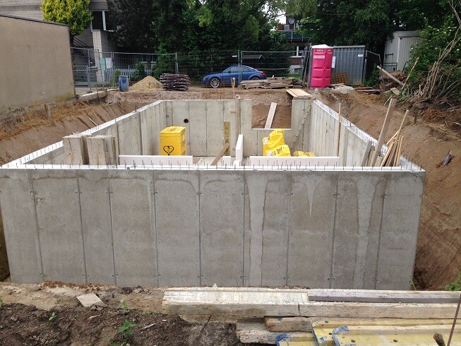 Hier mal ein erstes Bild von meiner Seite, wenn auch noch recht unspektakulär. Die Kellerinnenwände werden gerade hochgezogen. Wir haben ein "richtiges" Fenster geplant im Gästezimmer, aber ansonsten keine Laibungsfenster. Alle Kellerräume werden stattdessen an die Kontrollierte-Wohnraumlüftung angeschlossen.