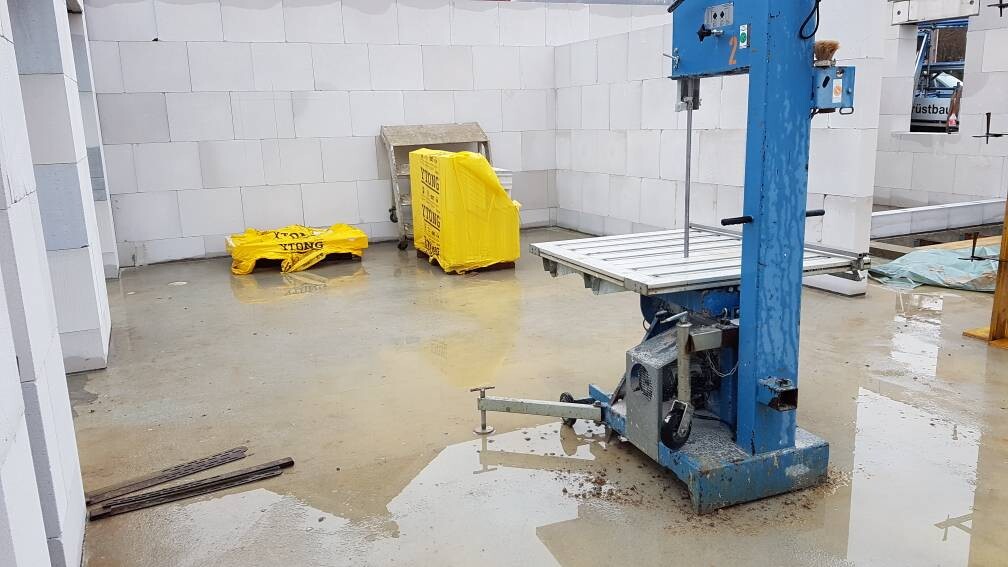 nachdem die vorgestern gegossene Bodenplatte gestern ausgeschalt wurde, wurde gleich die erste Steinreihe für den Keller gesetzt.