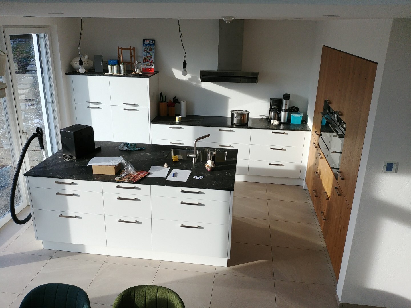 - Bei der Küche fehlt noch die Glasrückwand, weil der Küchenbauer dachte, einen Riss in der Steinplatte entdeckt zu haben. Das war aber ein Irrtum, nun wird die Rückwand am Dienstag eingebaut, wenn die Monteure für die Ankleide da sind.