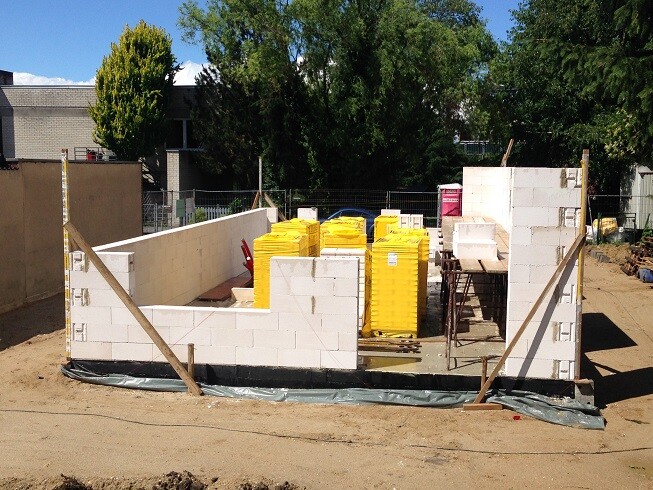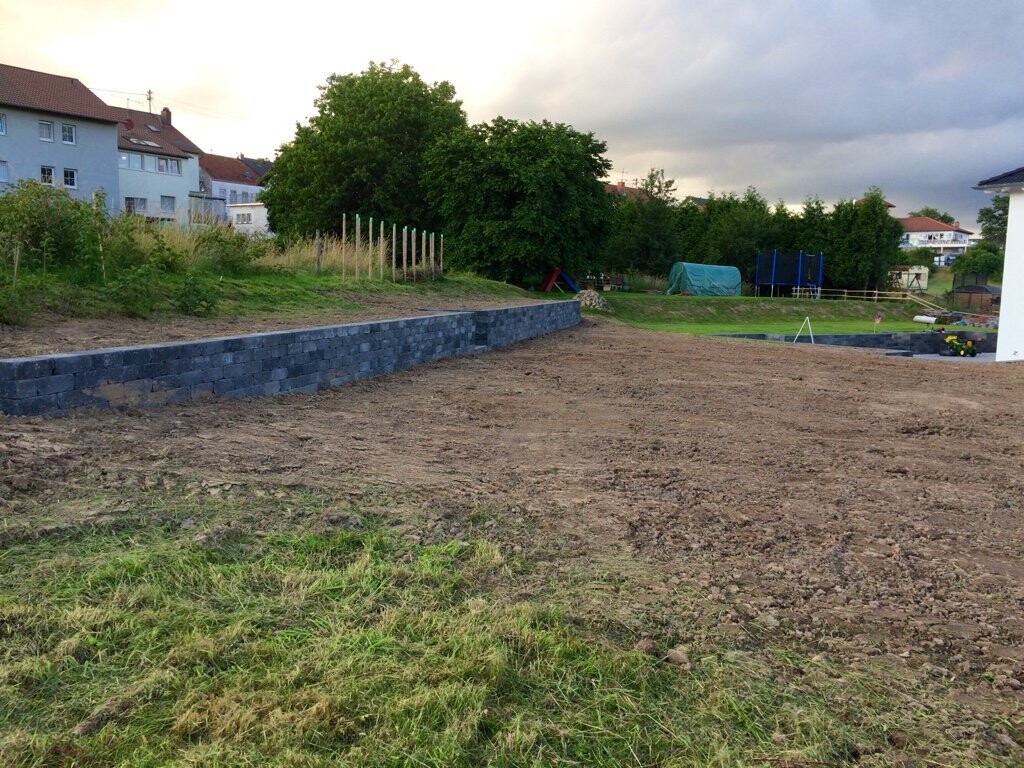 Montagmittag wurden die Steine geliefert, die Vorbereitungen fürs Mauern getroffen und die erste Reihe gesetzt. Gestern wurde dann gemauert, was auf den beiden Bildern zu sehen ist. Zumindest optisch der größte Sprung bisher.