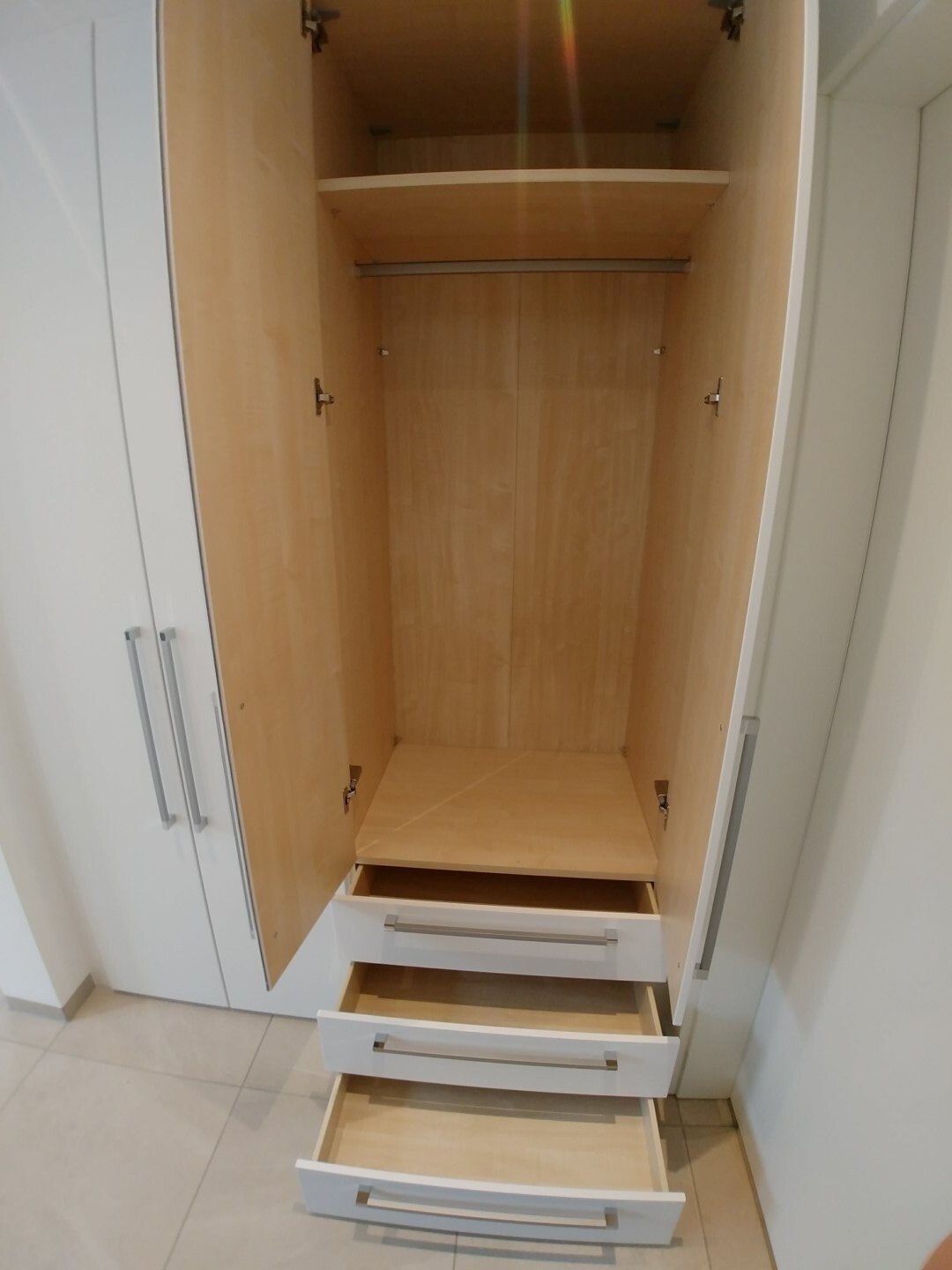Nachdem der Glaser mittlerweile die Spiegelwand und die Duschwand montiert hat, war heute noch der Schreiner da und hat die Garderobe eingebaut.