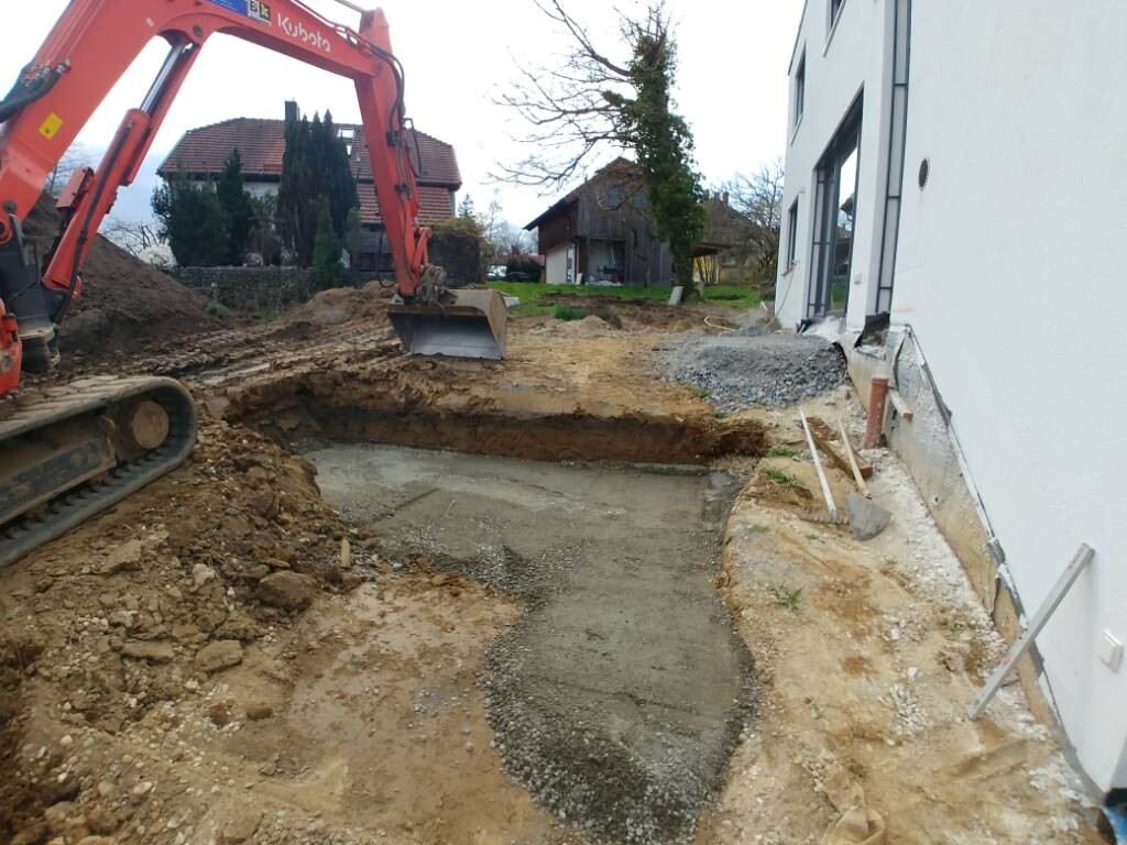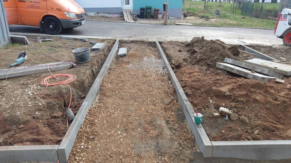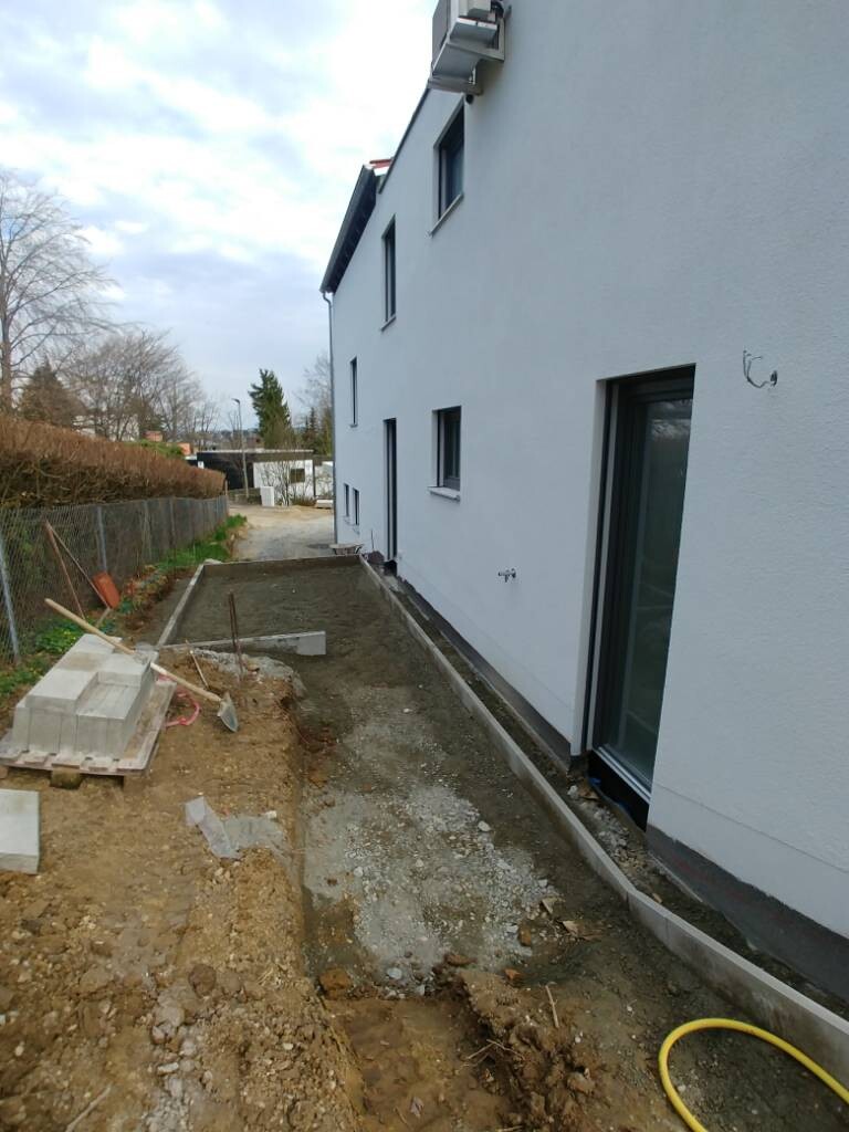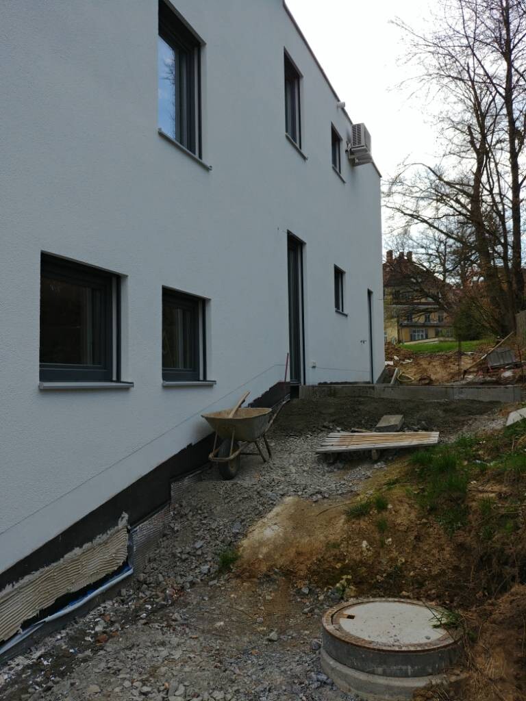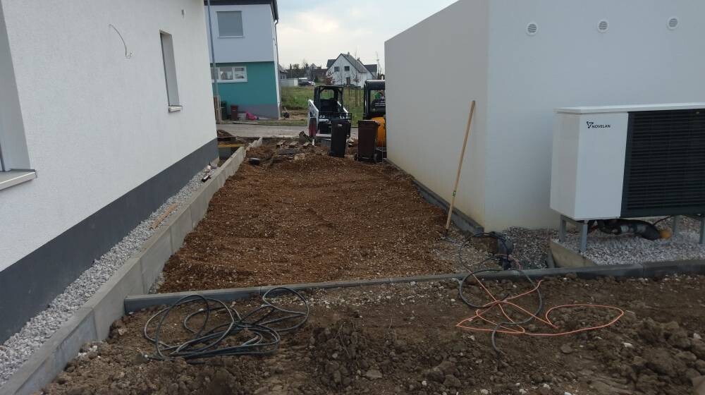 Seit gestern ist der Hauptunternehmer wieder am Werk und macht die Außenanlagen.