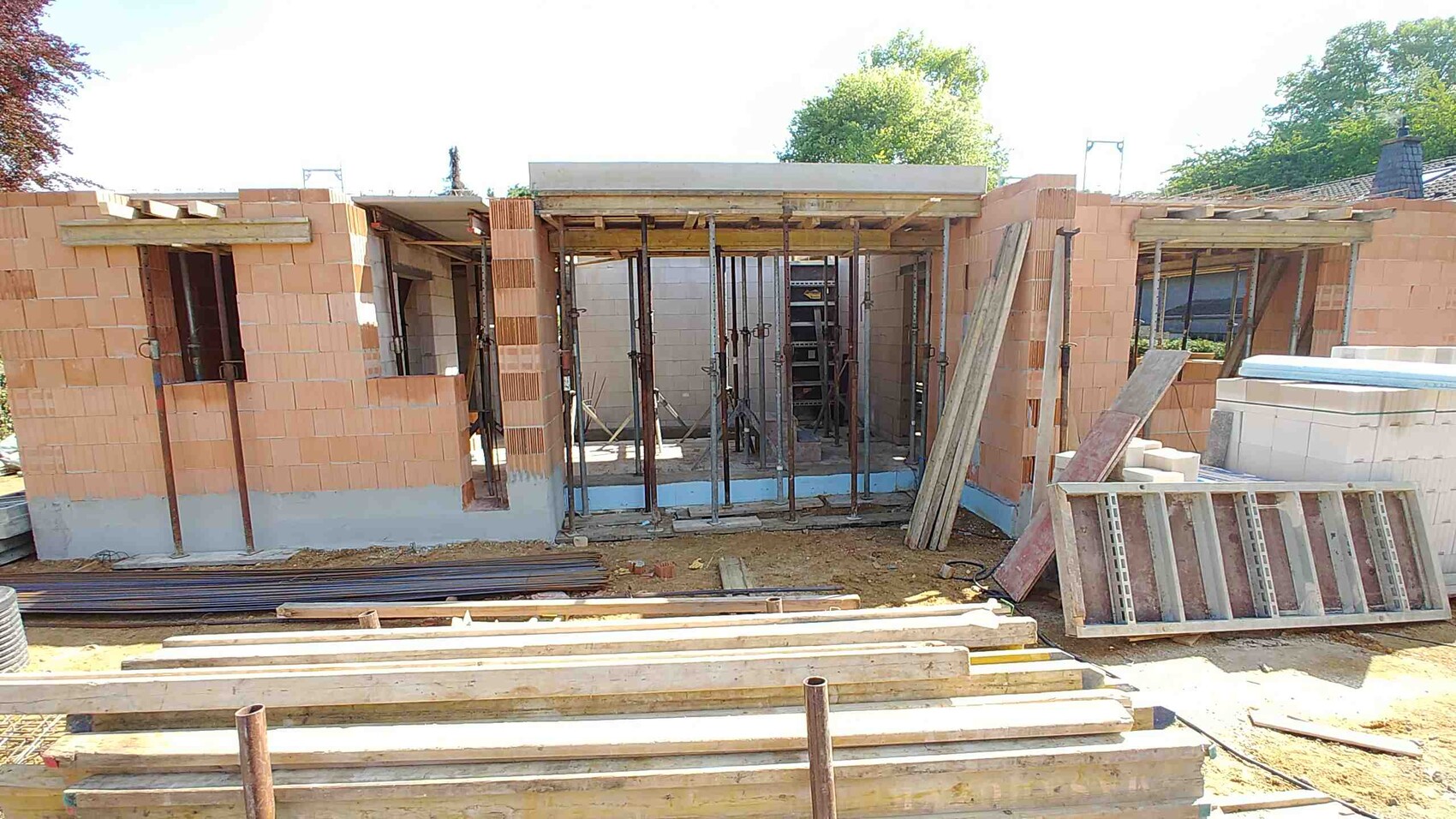 Was mich noch interessiert, ist folgendes. Wir haben ja schon die Fensteröffnungen sichtbar. Es ist aber so, dass man hier noch nicht die unterschiedlichen Brüstungshöhen sehen kann. Ich dachte schon, das sei möglicherweise fehlerhaft ausgeführt worden und habe nachgefragt. Der Bauleiter sagt, das ist normal; die vorgesehenen Brüstungshöhen werden erst später sichtbar. Ich frage mich, warum denn dann trotzdem solche Fensterausschnitte aktuell zu sehen sind. Das Küchenfenster nach vorne z. B. bekommt 1,25m Brüstungshöhe. Der Fensterrahmen beginnt aber schon bei deutlich unter einem Meter aktuell.