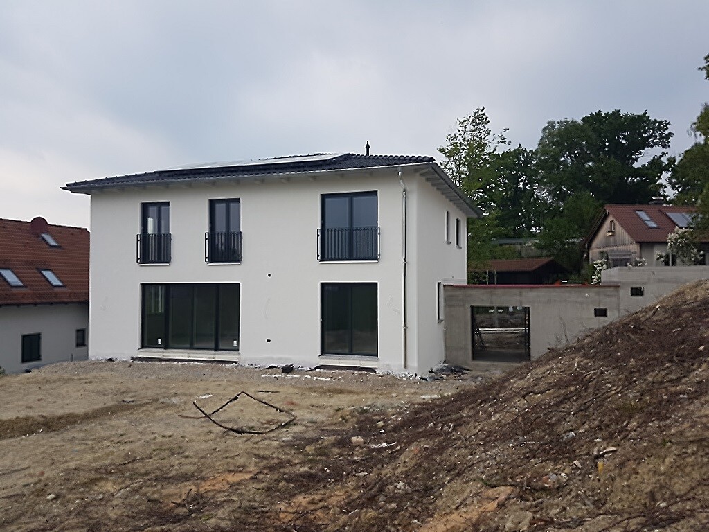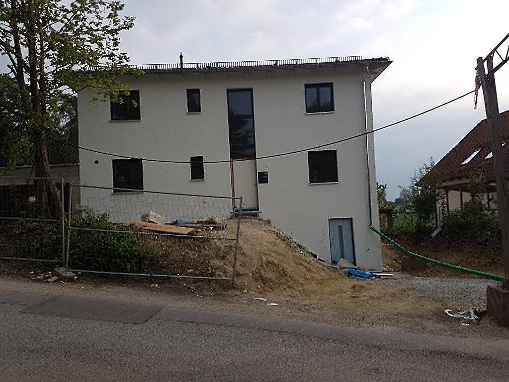 Und dieser kleine Dachüberstand sieht top aus, Wir haben ca. 80cm, hat Vorteile wenn es regnet da wird nichts nass ums Haus sieht aber nicht so modern aus.
