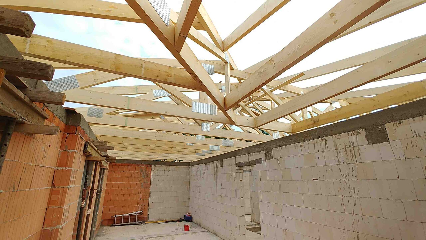 Das Staffelgeschoss wurde aus statischen Gründen im Holzrahmenbau gemacht und letzte Woche aufgestellt, der Rest ist 36,5 Poroton T7 (Perlit gefüllt).