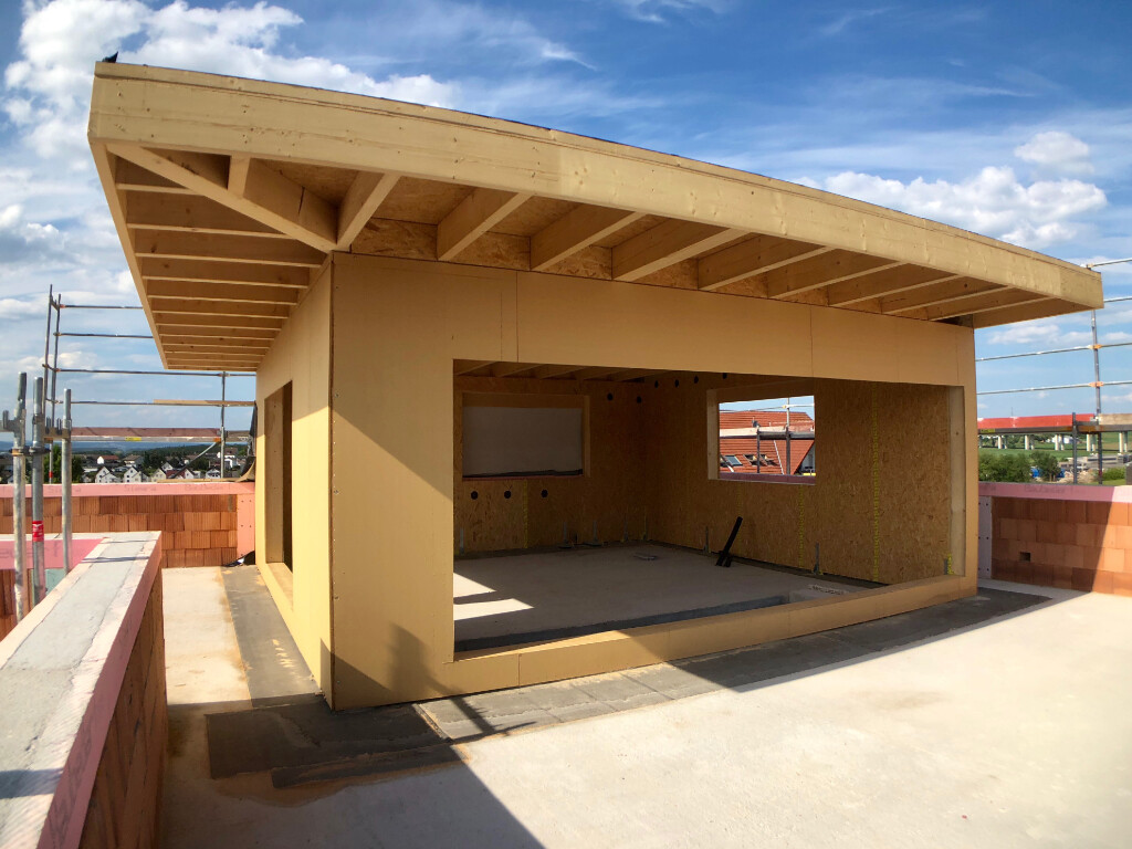 Das Staffelgeschoss wurde aus statischen Gründen im Holzrahmenbau gemacht und letzte Woche aufgestellt, der Rest ist 36,5 Poroton T7 (Perlit gefüllt).