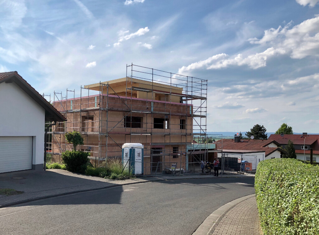 Und hier noch ein etwas älteres Bild mit Blick von hinten auf Küche/Esszimmer links und Wohnzimmer rechts. Da noch mit Kran und ohne Staffelgeschoss.