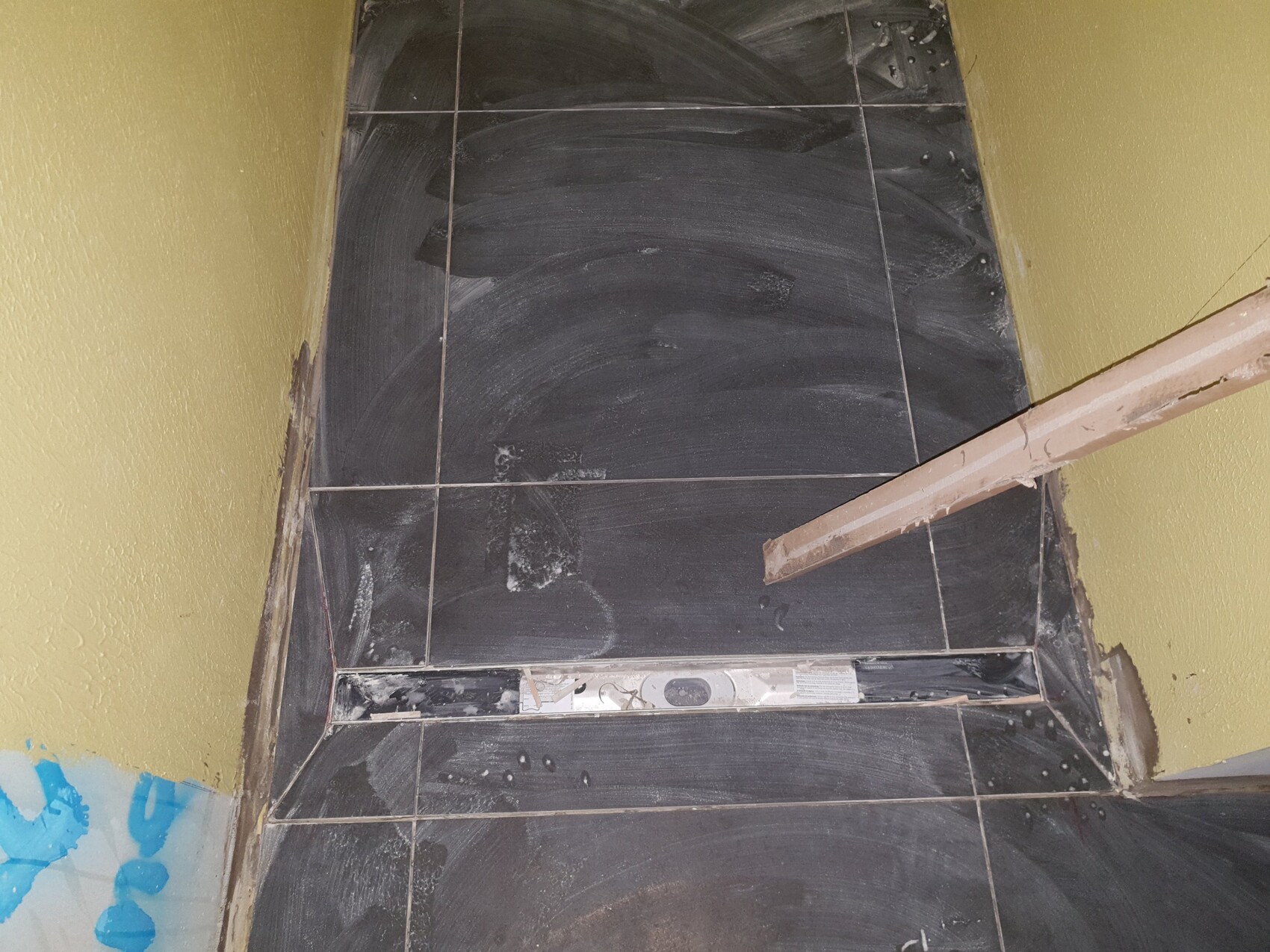 Dunkle Bodenfliesen im Badbereich eines Bauprojekts mit Abflusskante.