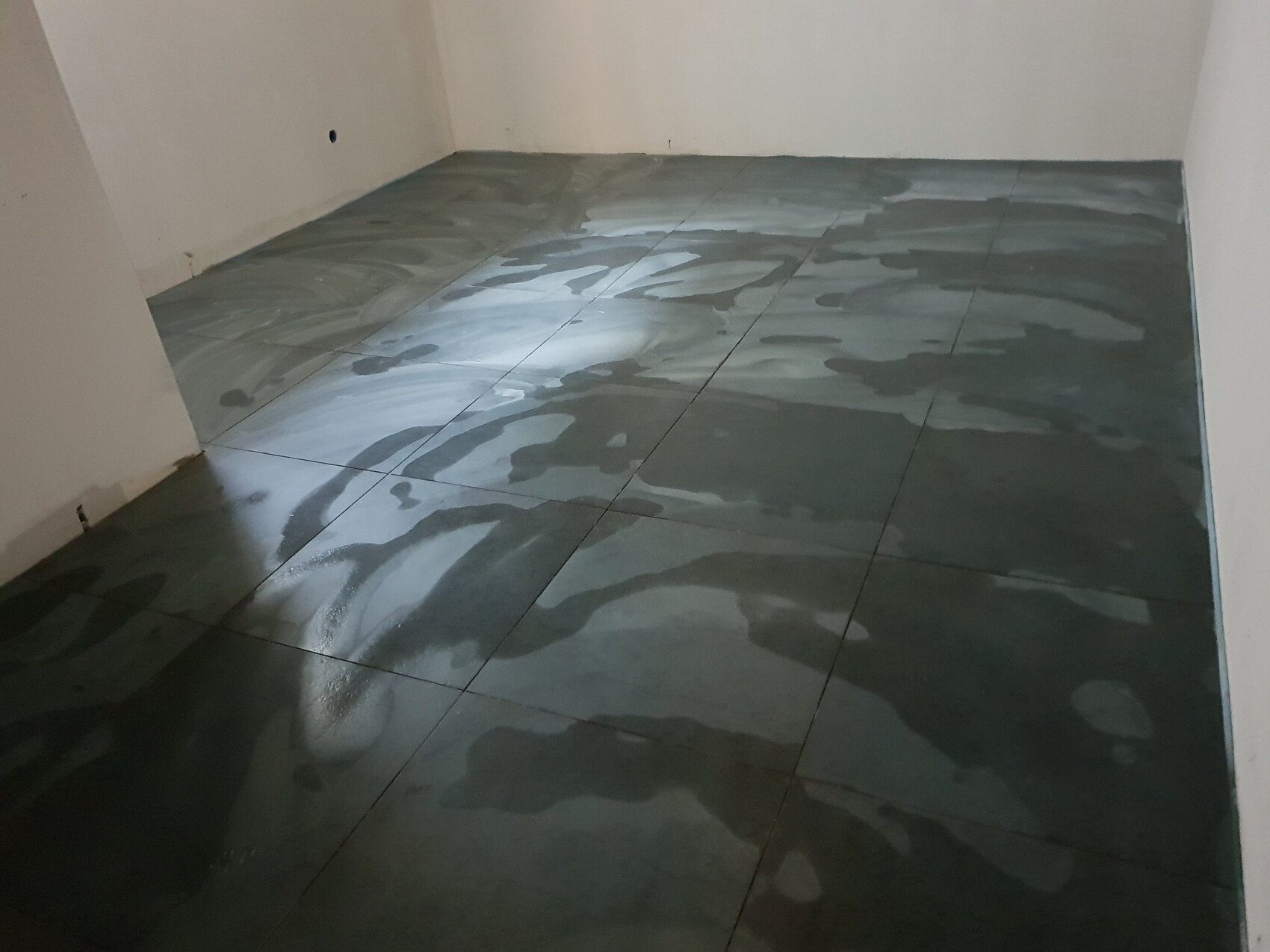 Kleines, leeres Zimmer mit nassen dunkelgrauen Fliesenboden und Wasserflecken.