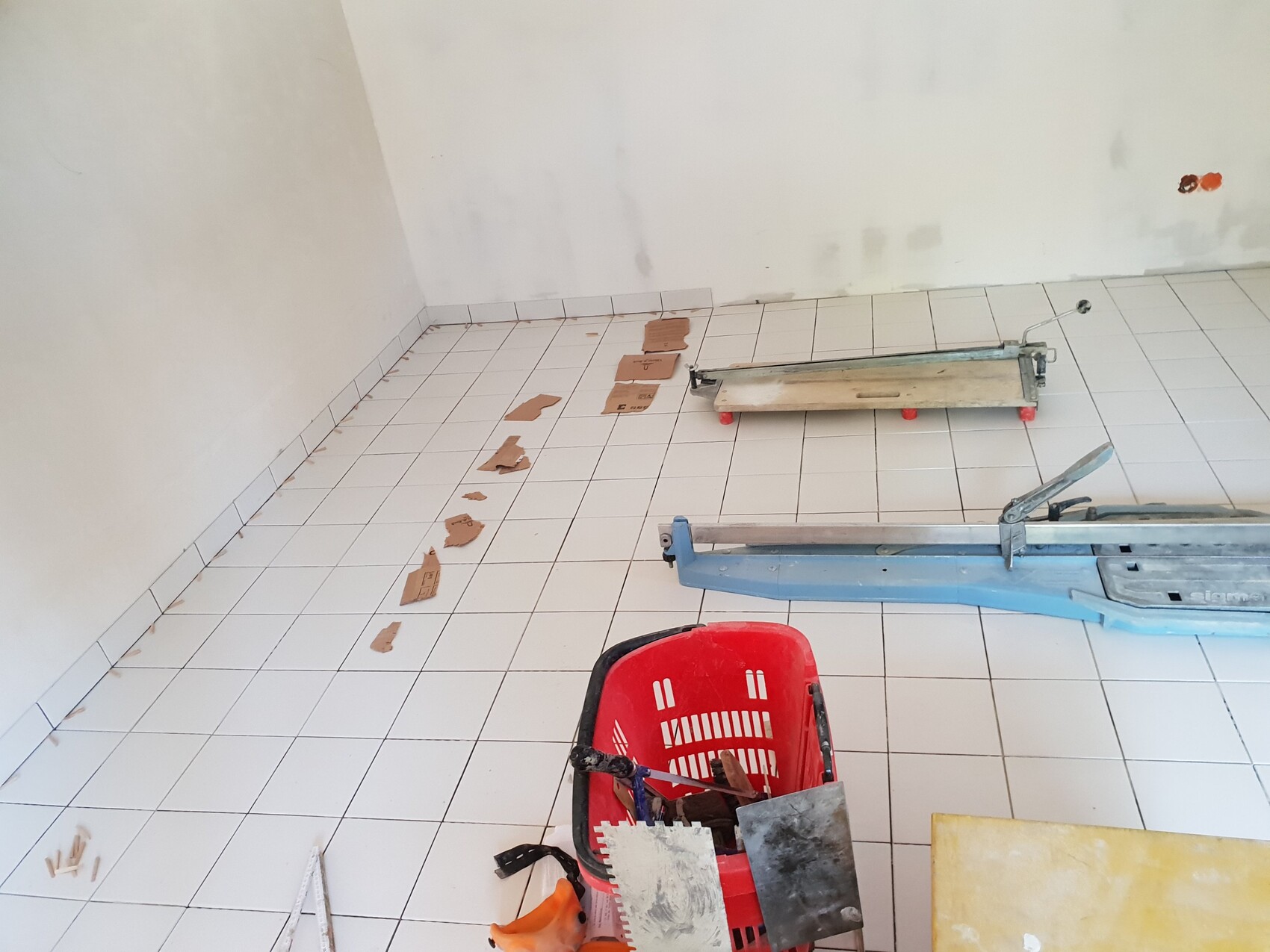 Fliesenlegerraum mit weißem Boden, Fliesenschneider, blauem Werkzeug und rotem Korb.