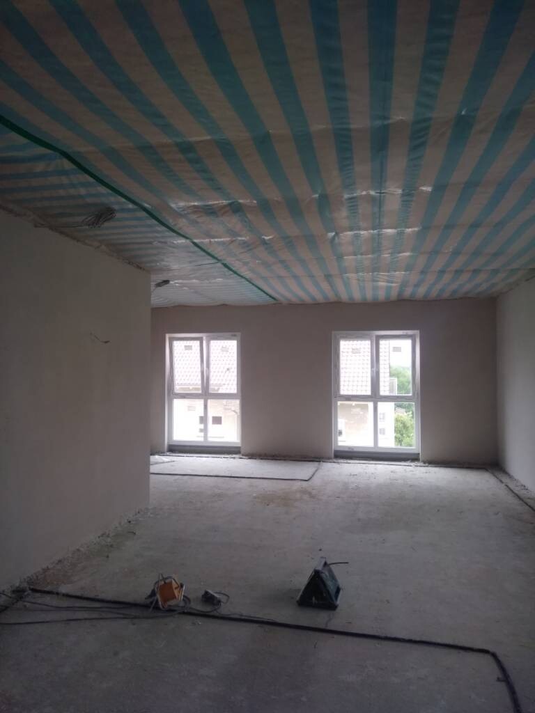 Bei uns ist (erst Mal) das Gerüst ab, damit hinterm Haus verfüllt werden kann und die Verputzer machen den Innenputz.