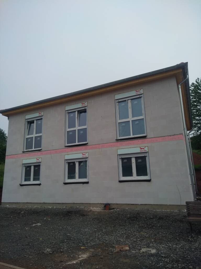 Zweistöckiges Rohbauhaus mit grauer Außenwand, Fenstern, pinker Dämmstreifen und Baugrund davor.