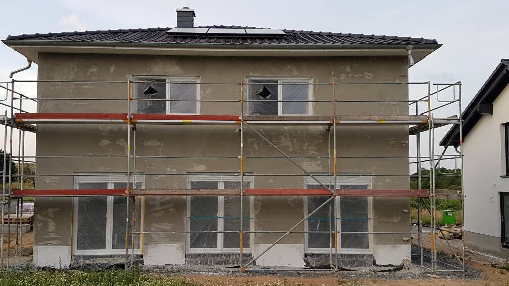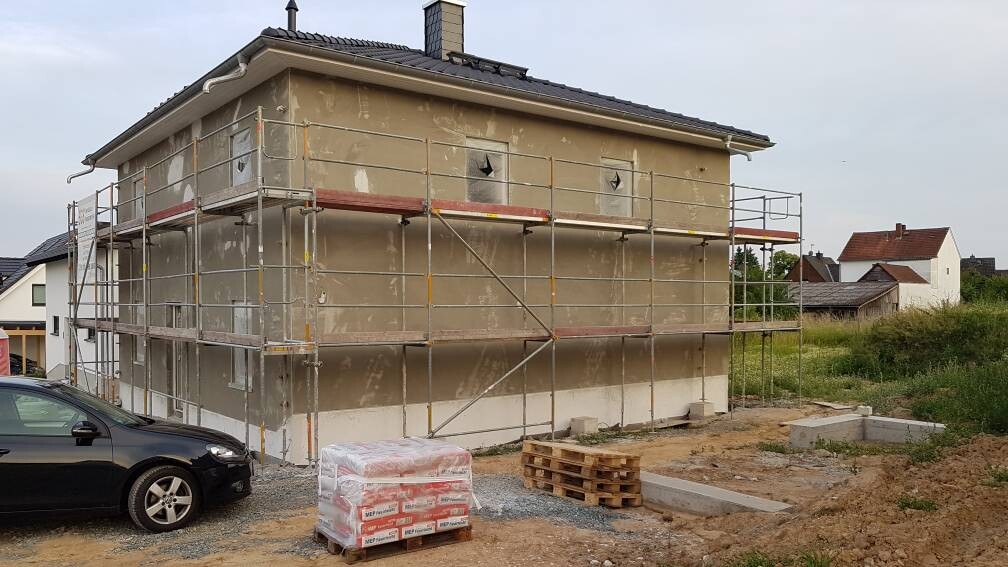 Bei uns haben sie nun mit dem Außenputz angefangen.schön mal eine Stadtvilla zu sehen die nicht überall mit bodentiefen Fenstern zugesetzt worden ist