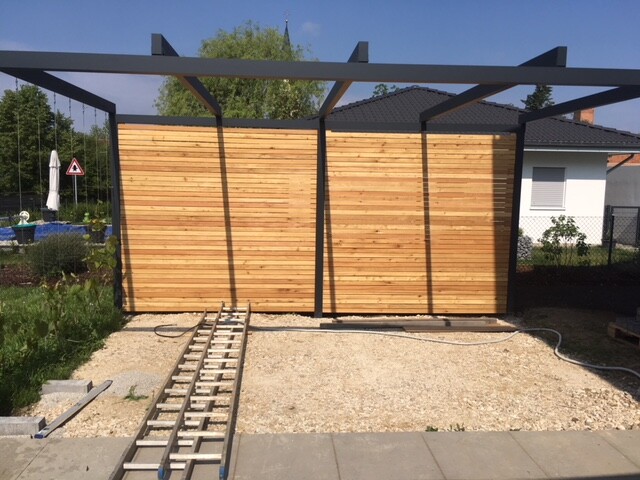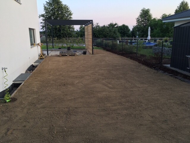 Keine L-Steine, nur Rasenbordsteine. Davor wird für den Carport-Geräteraum gepflastert.