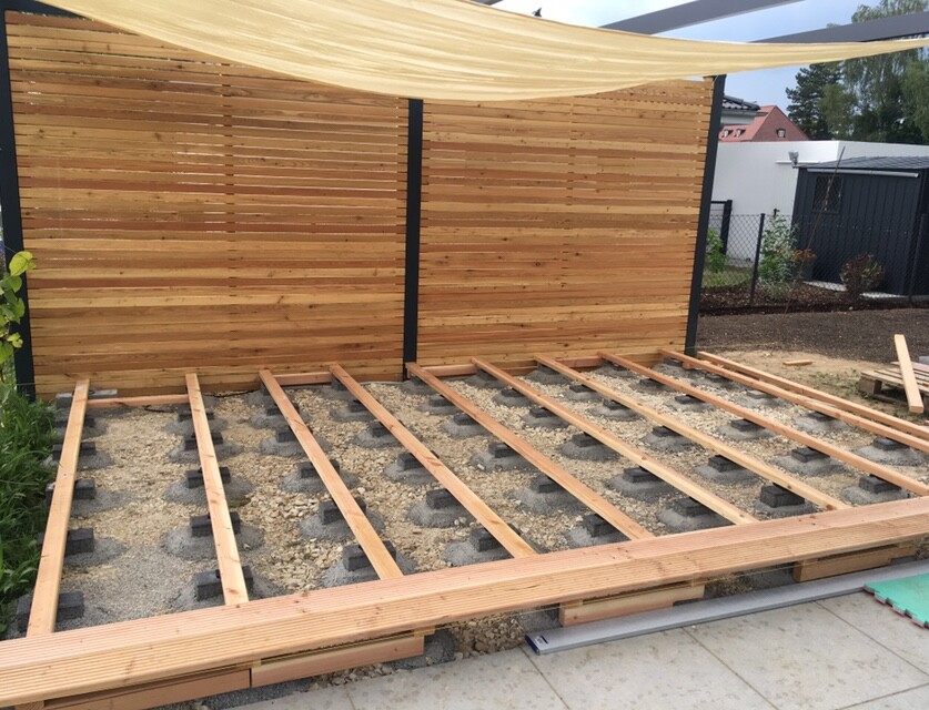 Garten: Holzzäune aus Latten, Bauholz auf Kies, Schattensegel darüber, Baustelle.
