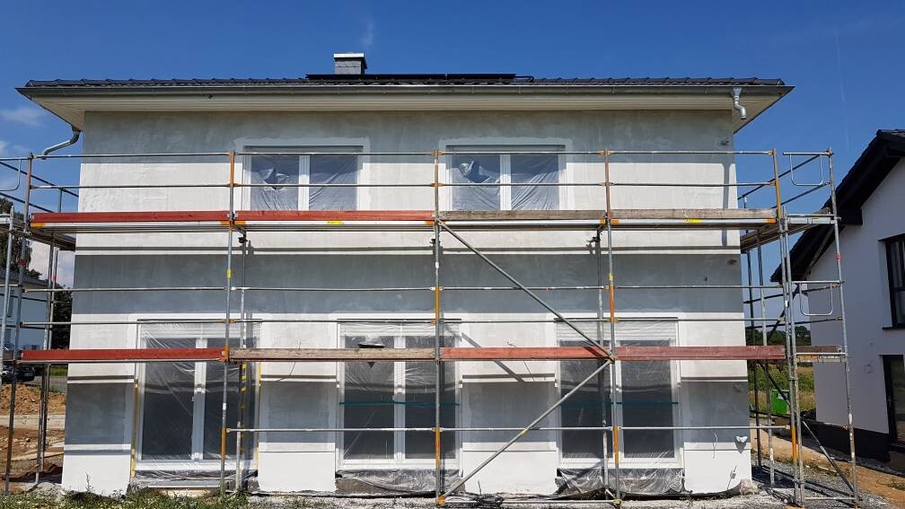 Zweistöckiges Haus mit Gerüst; Fassade wird bearbeitet, Fenster mit Folie geschützt.