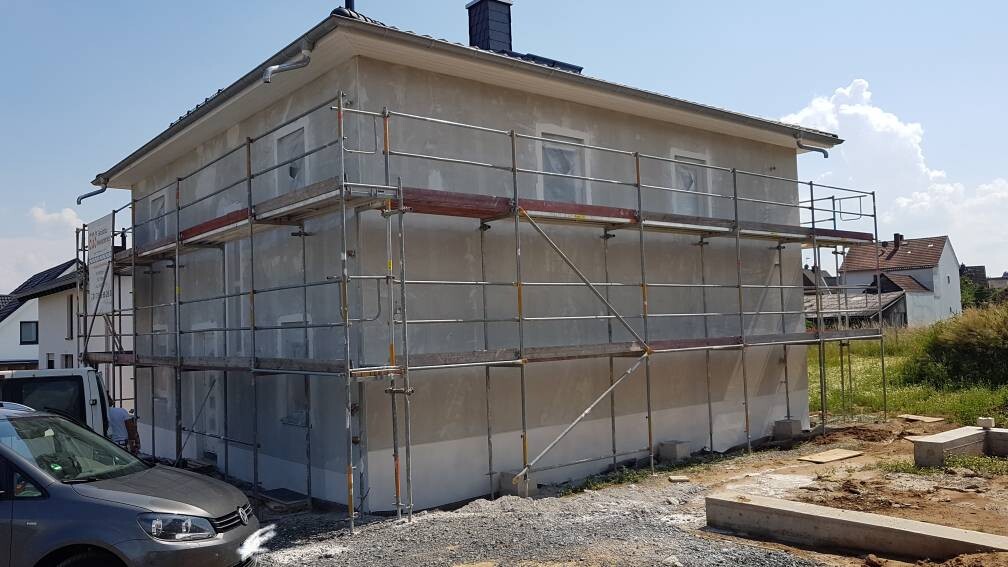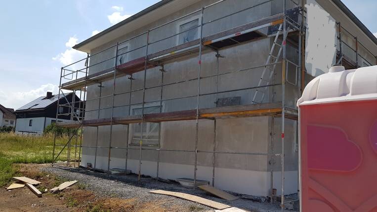 Zweistöckiges Haus mit umfangreichem Gerüstbau rundum auf einer Baustelle.