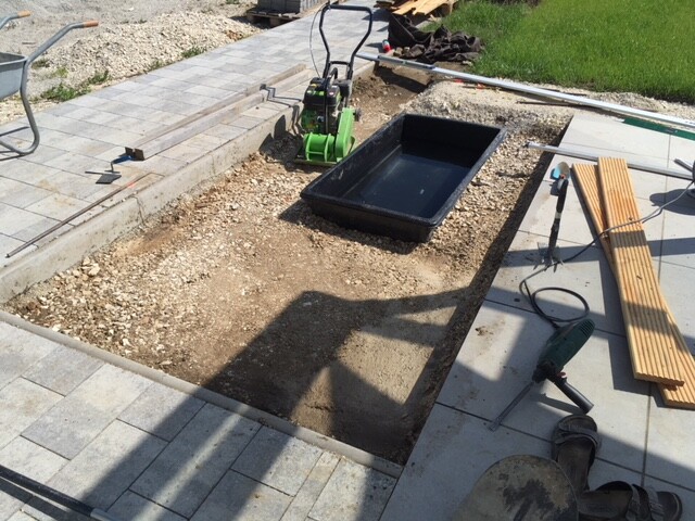 Frau hat sich Wassergeplätscher an der Terrasse gewünscht. Heute aber ruhte die Arbeit. Bohren, sägen.. man will ja nicht die Sonntagsruhe stören, vor allem nicht nach einem Fussball-Desaster. Morgen gehts dann mit dem Holzdeck weiter. Vllt kommen auch schon die Mauersteine?