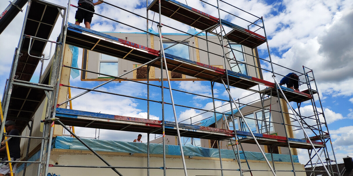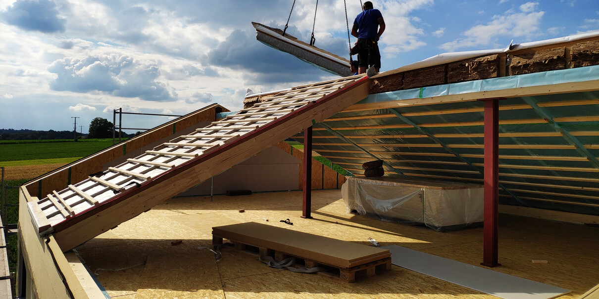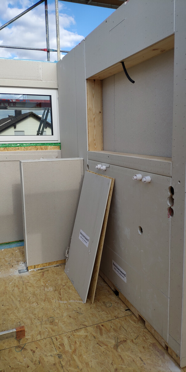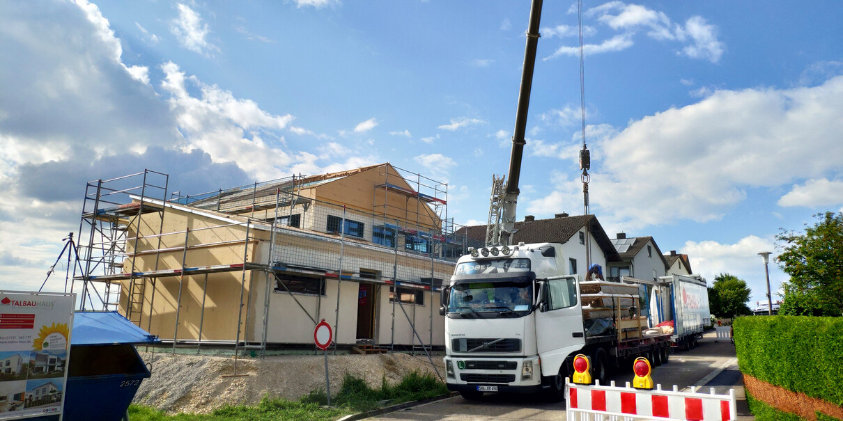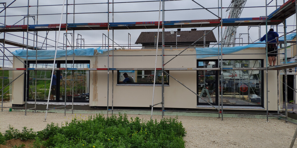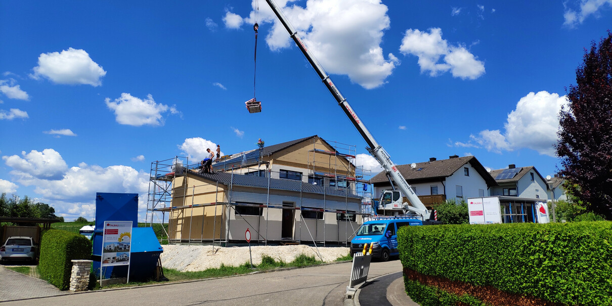 So die ersten 3 Tage Hausstellung sind vorbei und es wurde.....ein Haus! Dächer sind gedeckt, die Woche laufen noch ein paar kleinere Arbeiten, bevor es nächste Woche dann an die Hausanschlüsse, Wasserinstallation und Elektrik geht! Die Bodenplatte für die Garage soll auch nächste Woche kommen.
