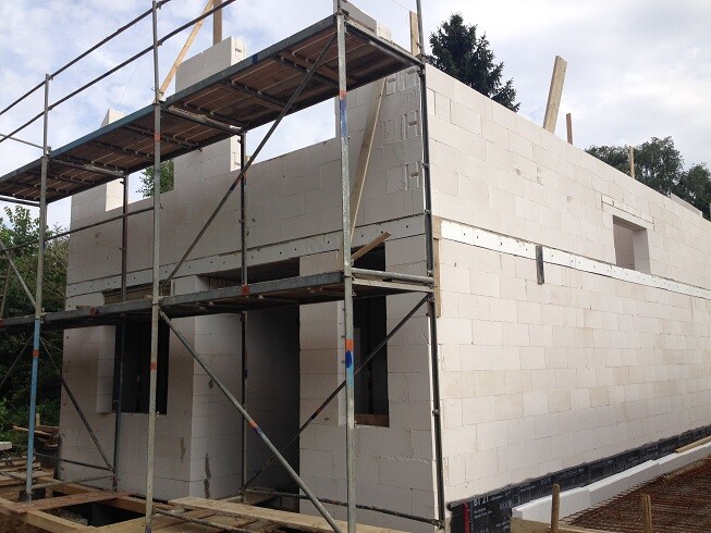 Rohbau eines Hauses mit Metallgerüst; unfertige weiße Steinwände und Fensterdurchbrüche.