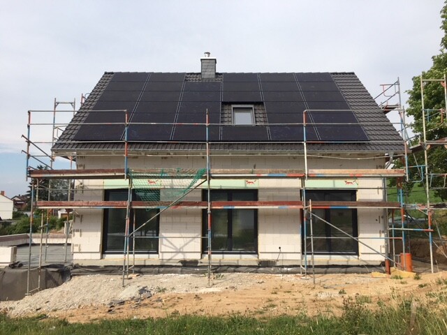 Gestern und heute wurden die photovoltaikmodule auf dem Dach installiert und heute kam die Verputzer-Kolonne und hat die Wände grundiert sowie die Eckwinkel gesetzt.