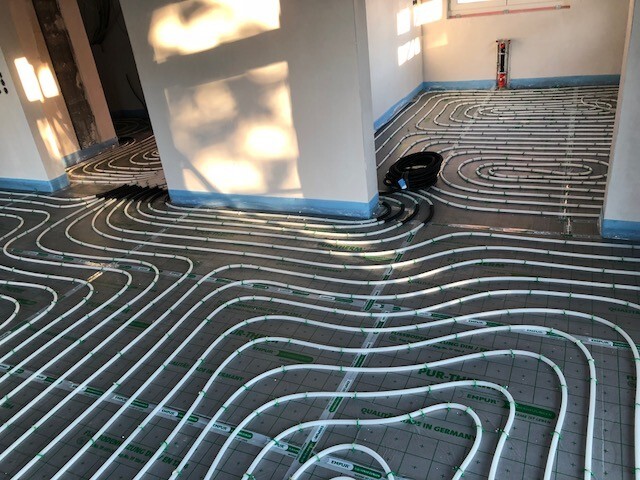 Unterbodenheizung: Weiße Rohre in Schleifen auf dem Boden eines Installationsraums.