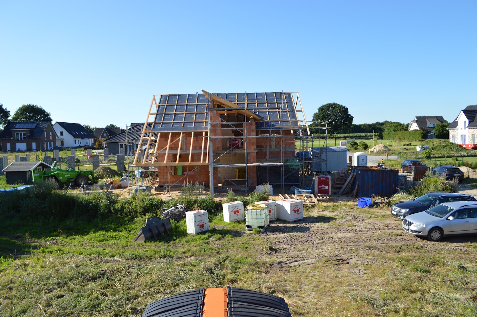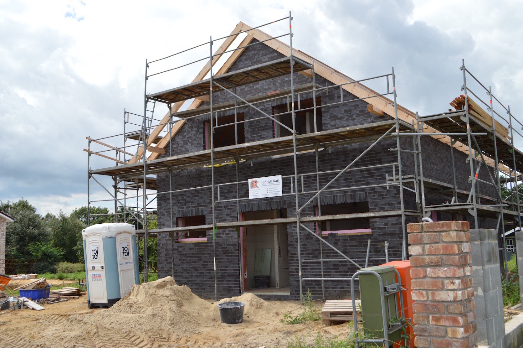 Sind nicht die aktuellsten Bilder, mittlerweile sind die Klinkerarbeiten abgeschlossen. Der Erker wird weiß verputzt