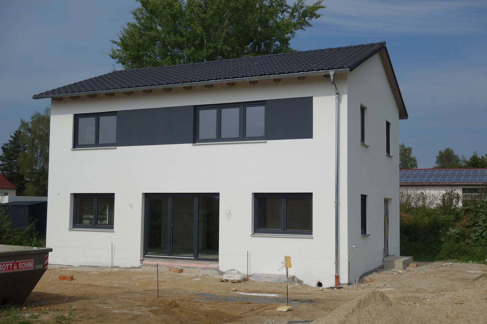 Hallo Daniels87, ich finde es ganz clever gelöst mit dem dunklen Streifen im Obergeschoss.. dadurch kaschiert ihr optisch die Unregelmäßigkeit der Fenster.. Kommt im Sockel noch mal die gleiche Farbe? LG Steffi.Hallo Steffi, das mit dem Sockel wissen wir noch nicht genau. Entweder grau wie die Dachunterseite, oder antrazith.