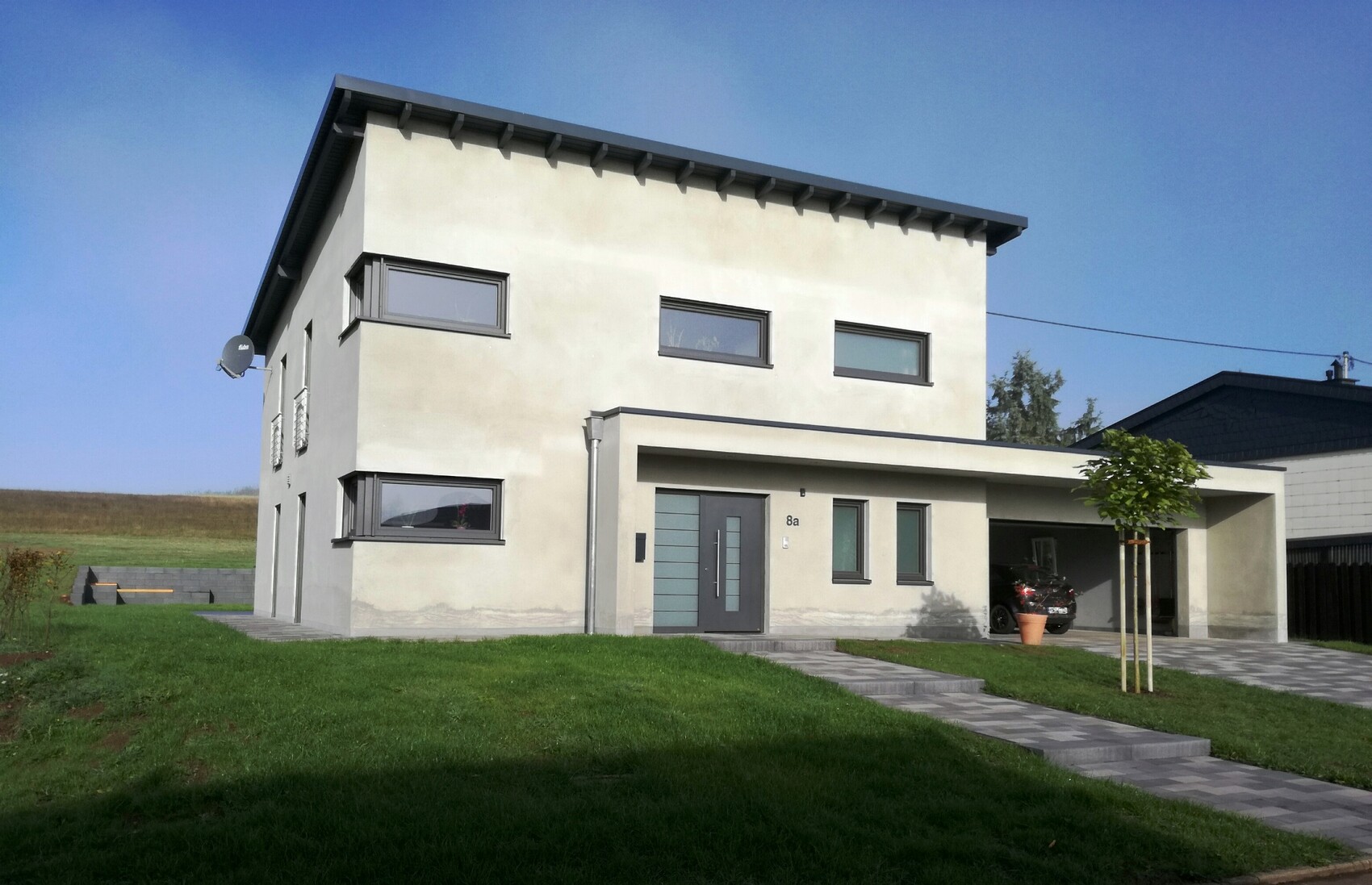 Außenanlage ist jetzt soweit fertig (bis auf ein paar braune Flecken im Rasen).