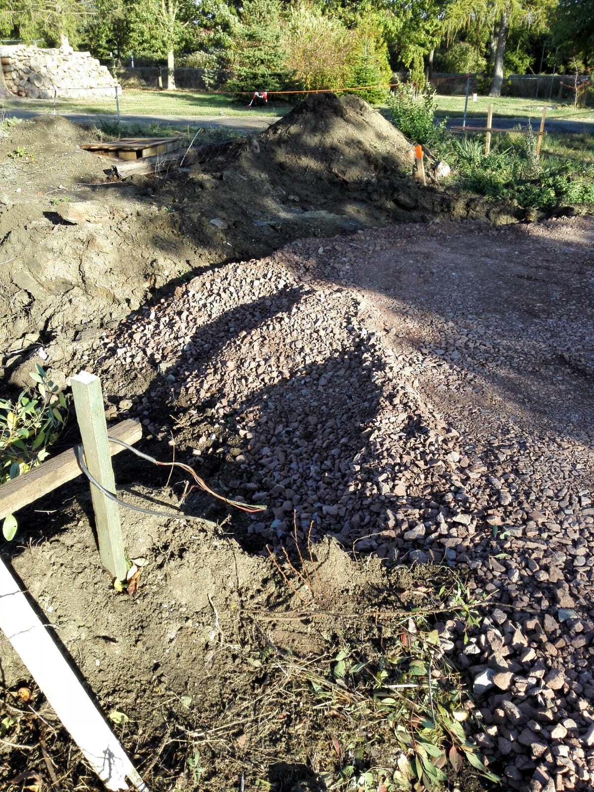 Baustelle mit Erdarbeiten, Kieshaufen und Graben für Fundament