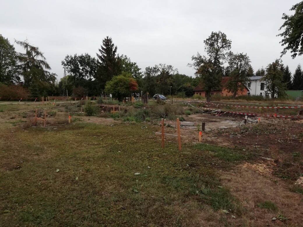 Baugrundstück mit Gruben, Absperrband und Holzpfosten, unbebaut und offen.