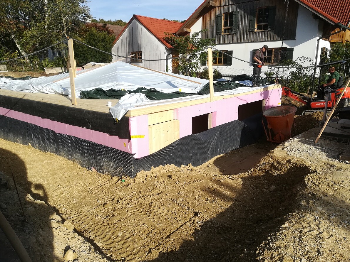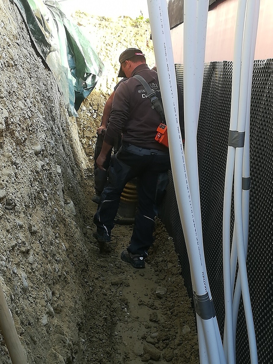Bei uns wird die Baugrube wieder zu gemacht und verdichtet.