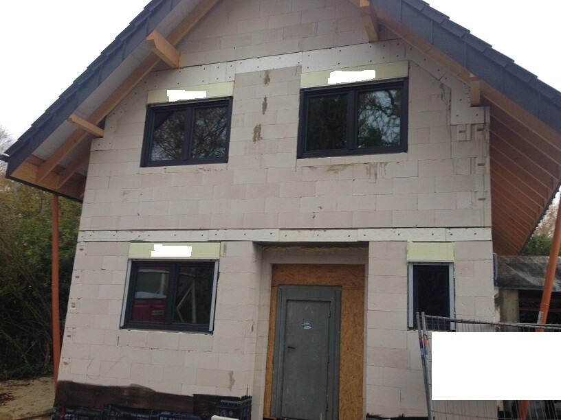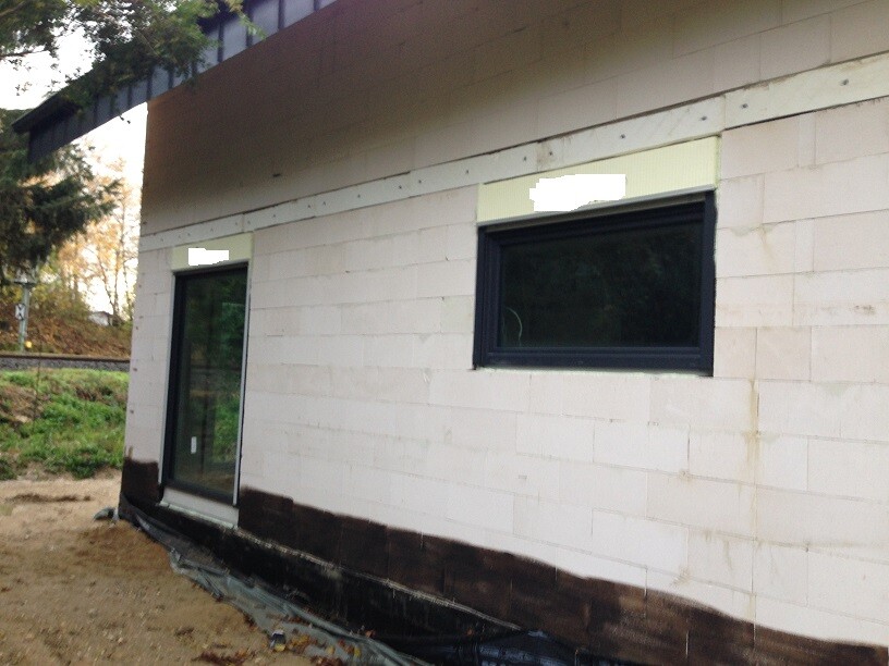 Und die Fenster kamen diese Woche rein, dazu drei Bilder. Das sind insgesamt zwölf Elemente, wobei das Fenster im Keller (Abböschung) und das im Treppenhaus über der Garage auf den Fotos nicht zu sehen ist.