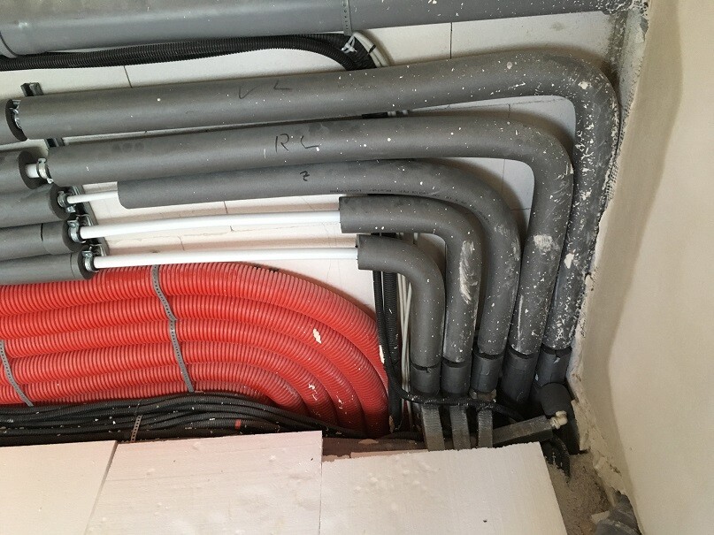 btw: mir fällt auf, dass auf den Rohren der Fußbodenheizung in den Türübergängen die Überschubsicherungen fehlen. Überall, wo die Leitungen eine Estrichdehnfuge überbrücken, müssen die eigentlich abgedeckt sein, damit der Estrich beim Dehnen an der Stelle auf den Rohren gleiten kann.