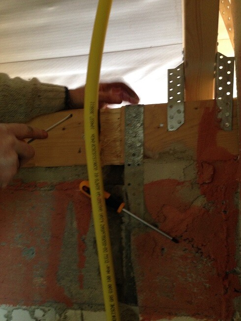 Da waren wir schon bei der Arbeit. Die Wand aufgestemmt für ein 100er Rohr, den Ringbalken eingeschnitten, die Gasleitung dann aber vor der Fußpfette langgelegt. Der Putzer kann die Wand ja 5 cm aufdicken, oder wie?