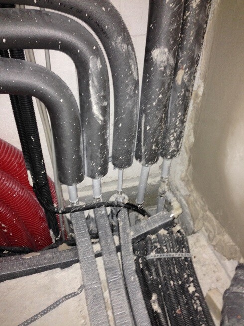 12 - da habe ich mal die jetzt nicht mehr zugänglichen Stellen an den Wasserleitungen isoliert, wo der Installateur geschlampt hat (oben waagerecht Isolierung weggenommen und unten rechts reingestückelt)