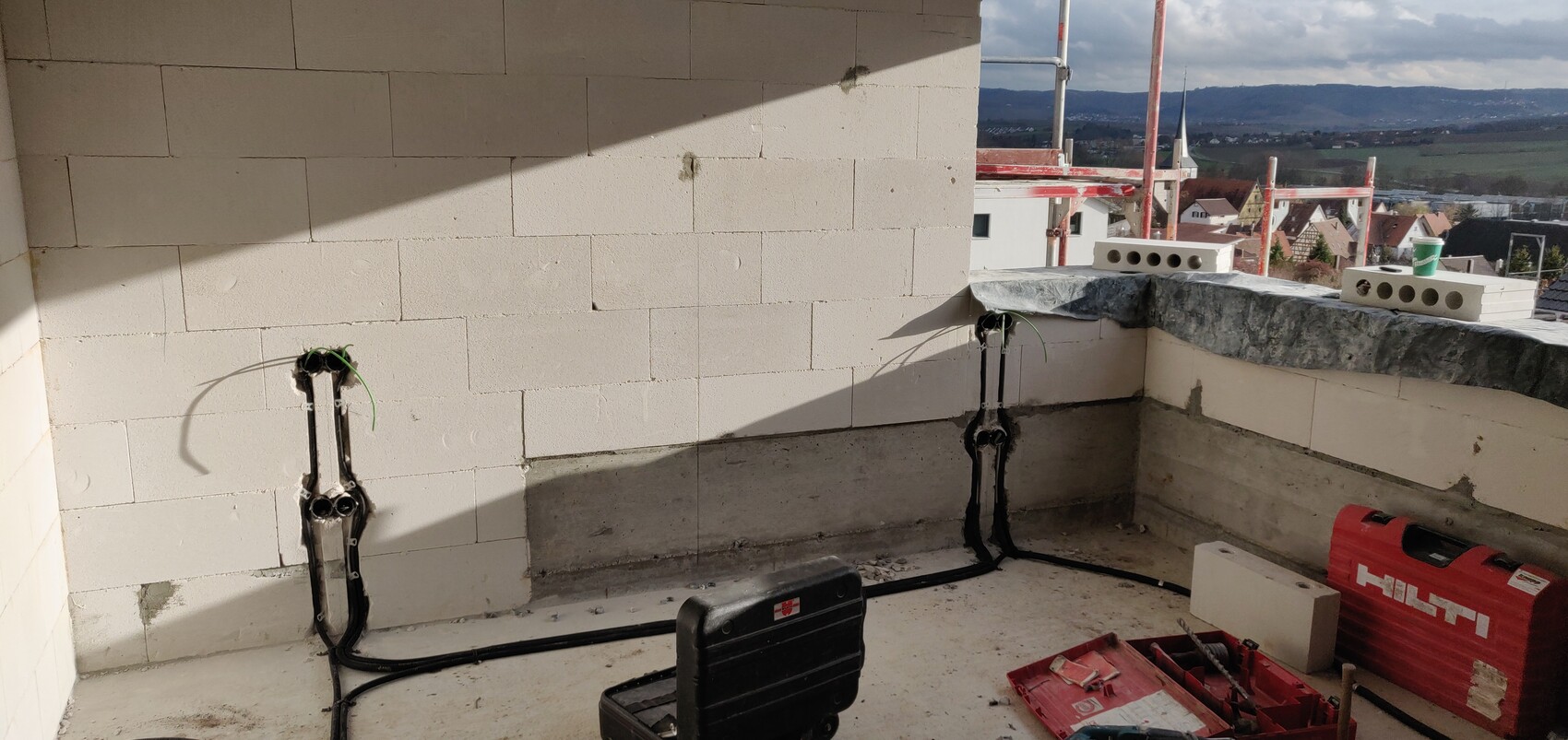 Baustellenszene auf Dachterrasse: weiße Blöcke, Kabelkanäle, Kabel, Werkzeugkoffer und Hilti-Case.