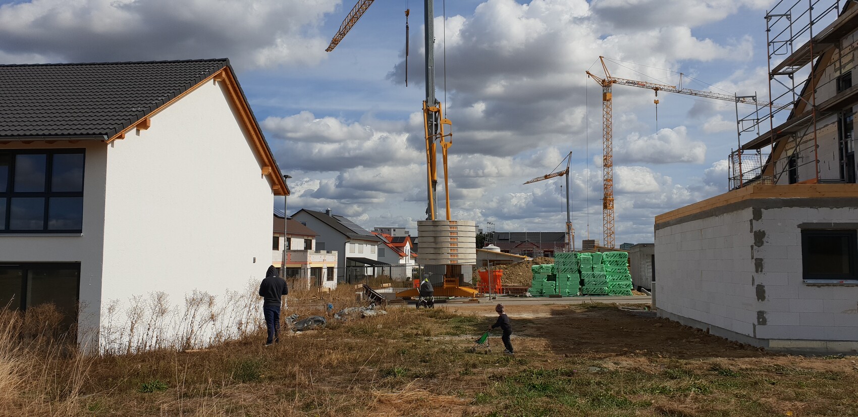 Baustelle mit Kranen, Gerüsten und unfertigen Gebäuden; Mensch und Kind im Vordergrund.