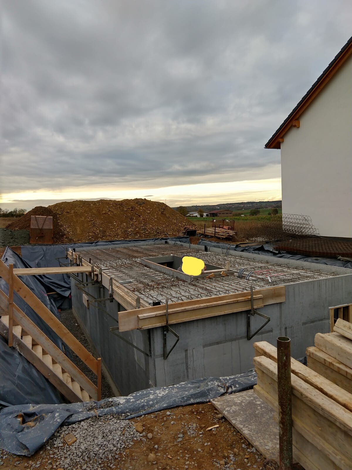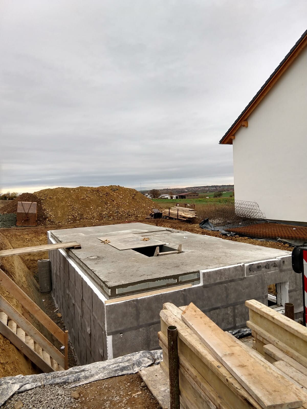 Baugrundstück: Betonfundamentplatte mit Loch, Holzbohlen, Erdhügel links, weißes Haus rechts.