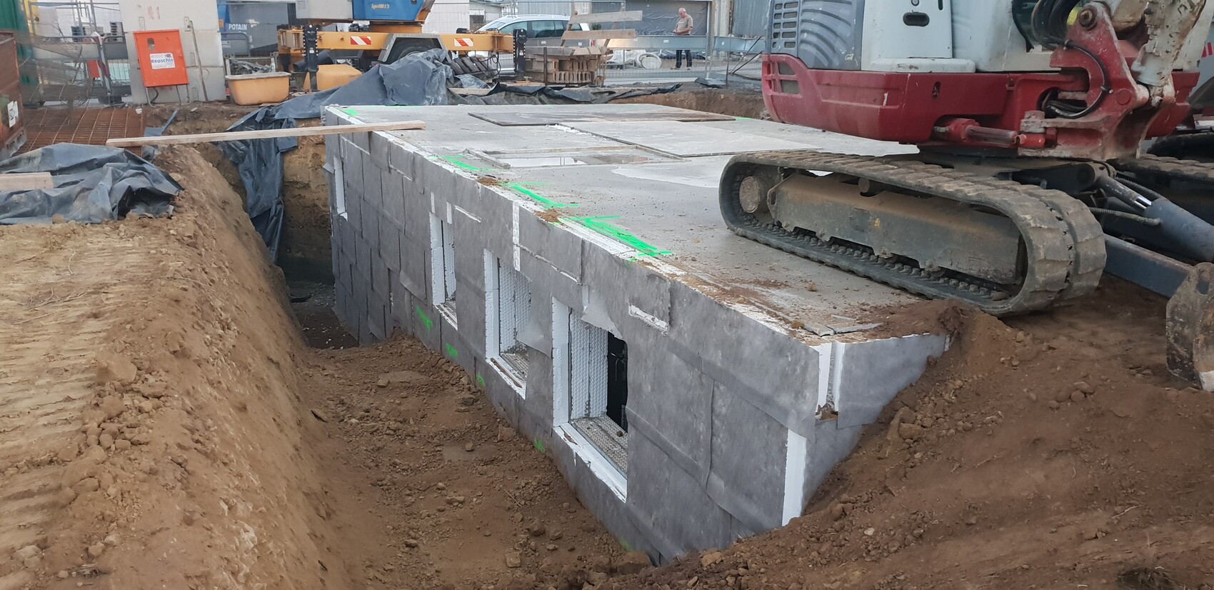 Baustelle mit Erdgraben und Betonblockwand; Bagger mit Raupenfahrwerk rechts.